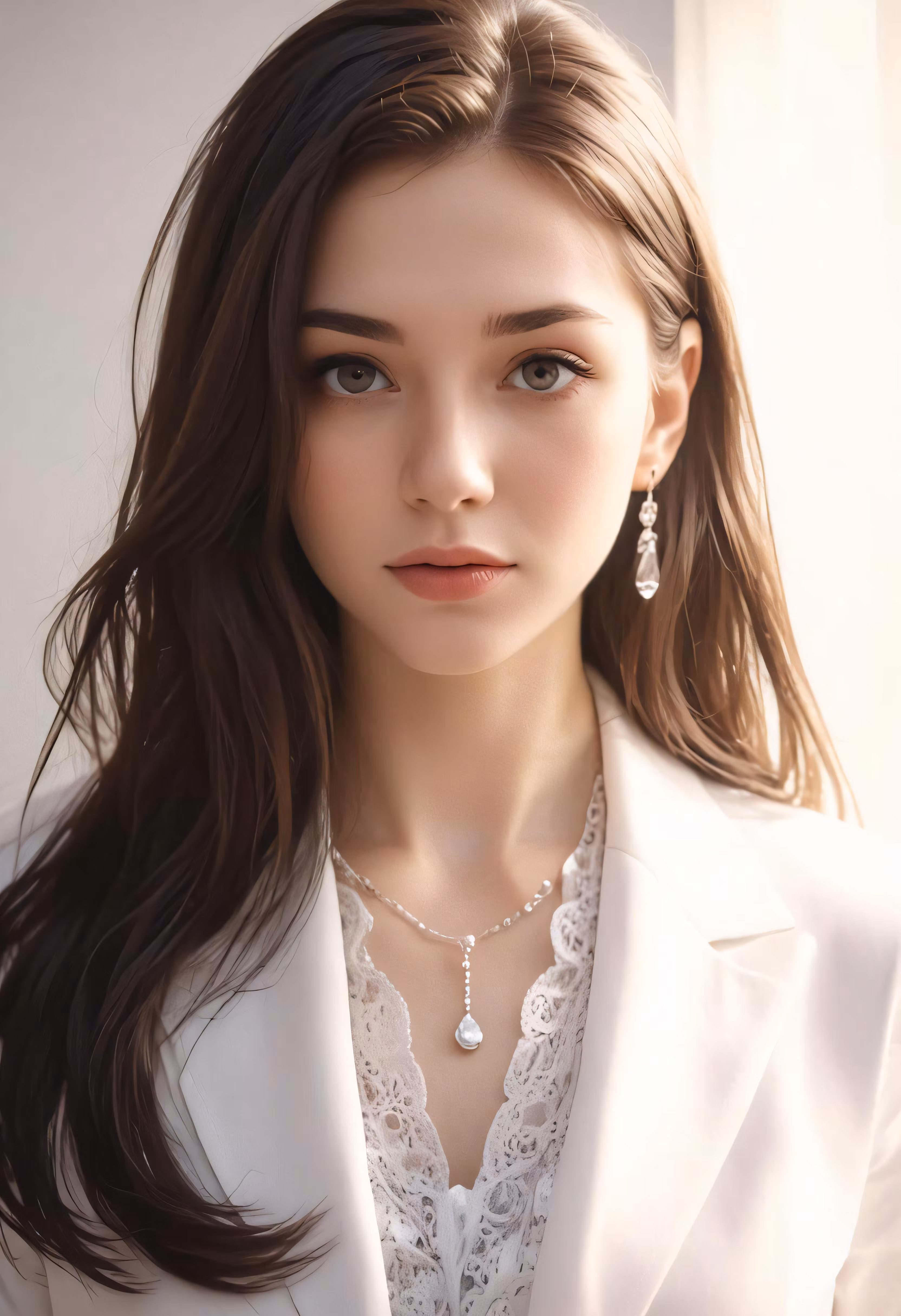 High resolution picture, free to use, a woman with long hair wearing white jacket and pearls
