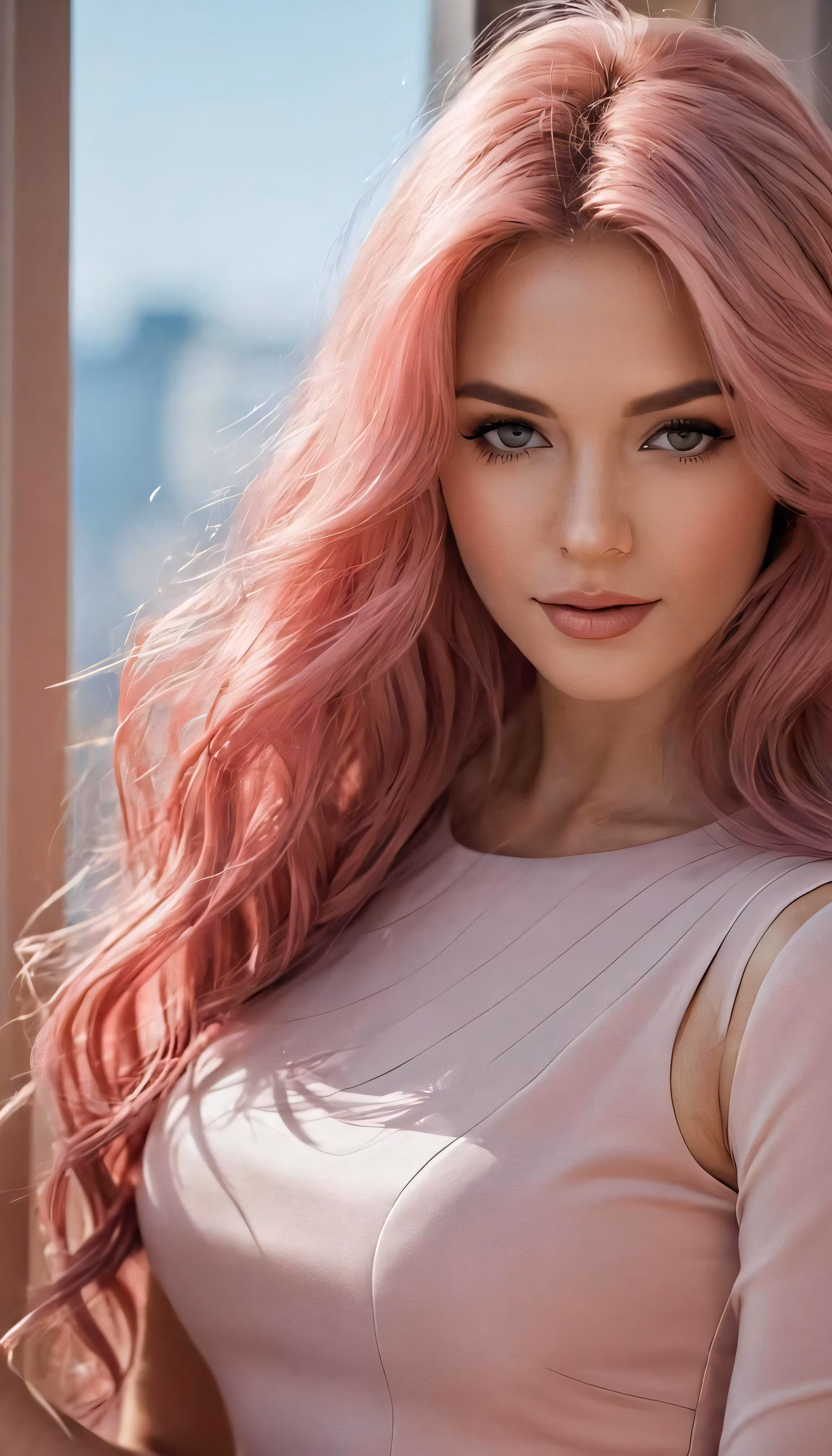 High resolution picture, free to use, a woman with long pink hair looking into the camera