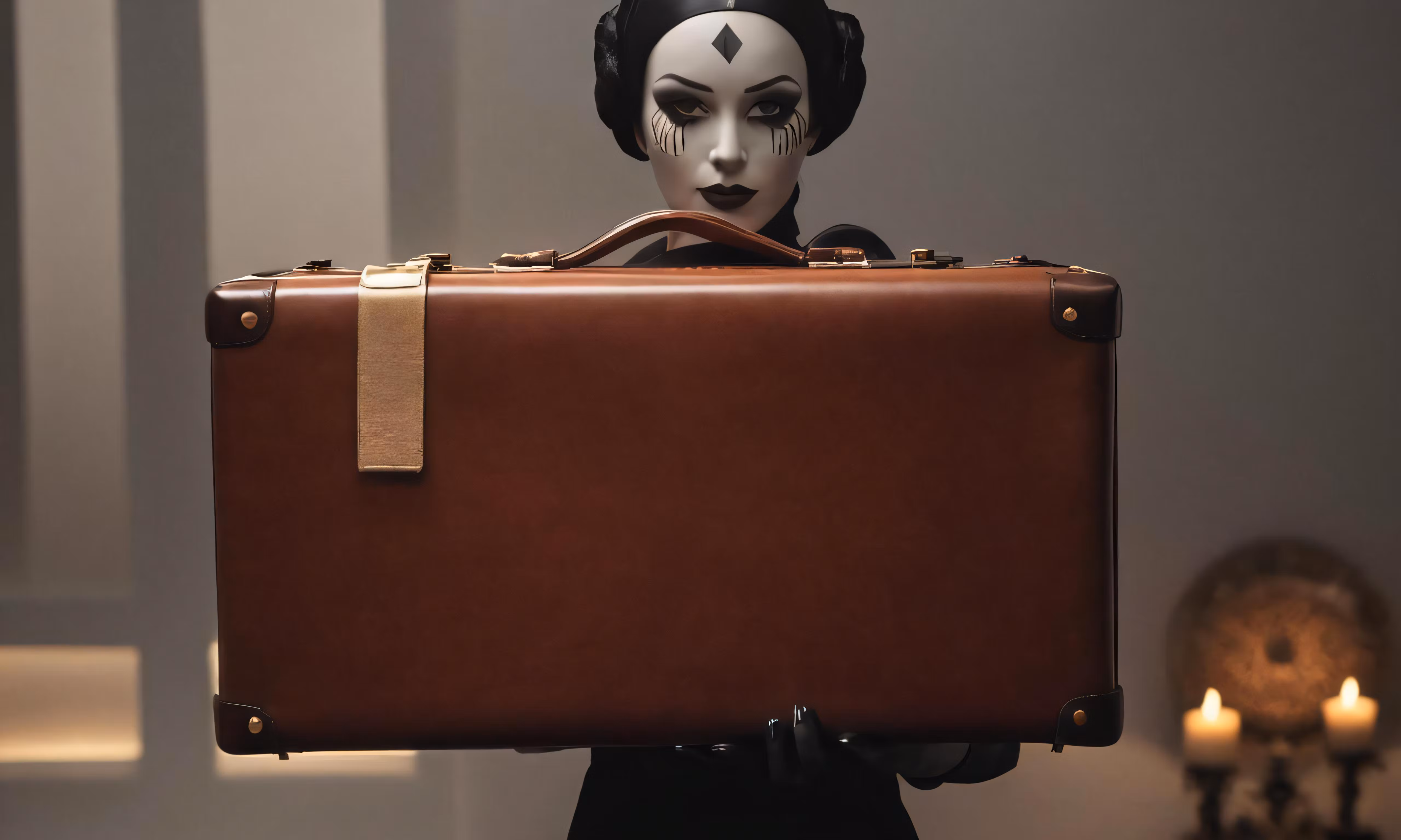 High resolution picture, free to use, a woman with makeup on her face carrying a suitcase
