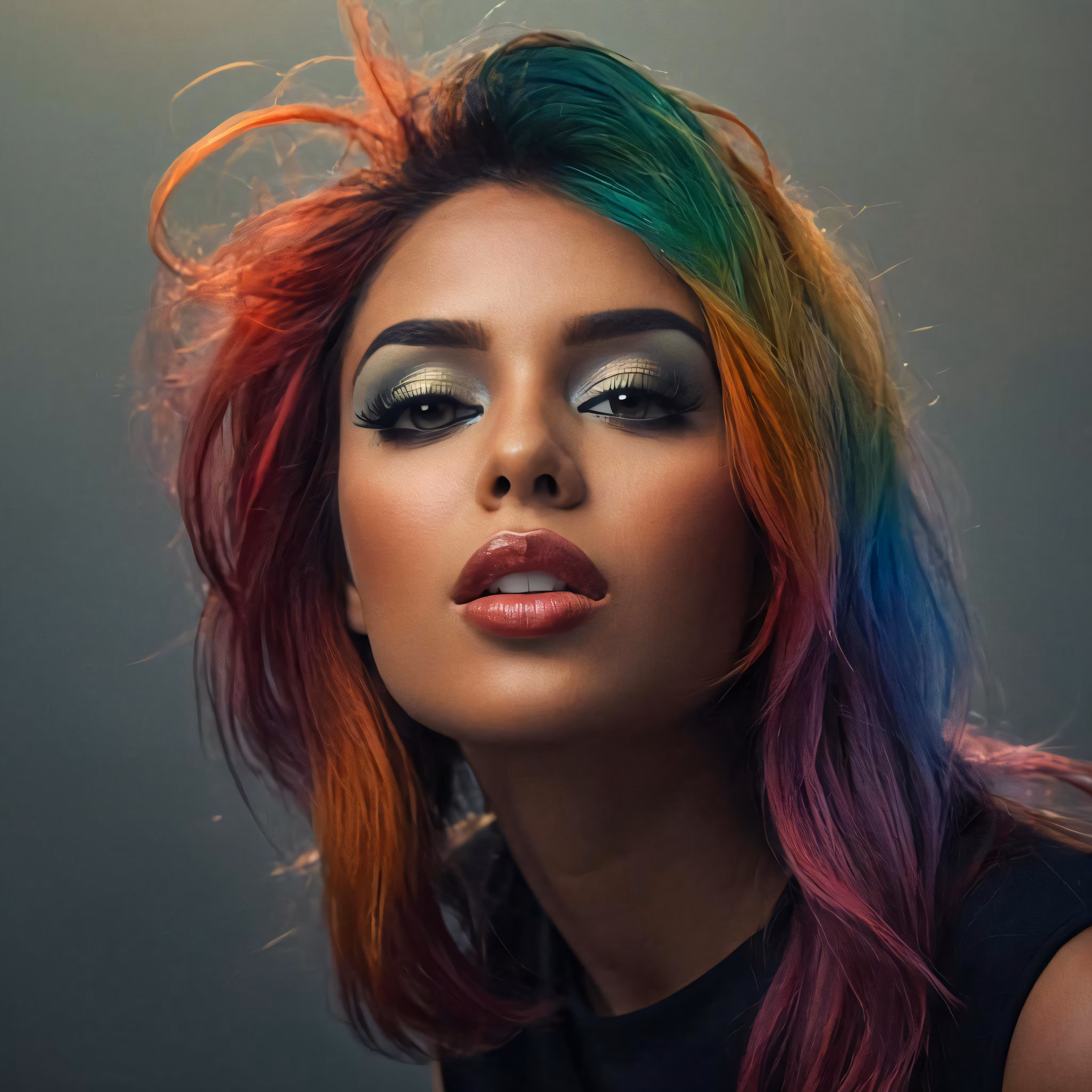 High resolution picture, free to use, a woman with multi colored hair and make   up looks into the distance