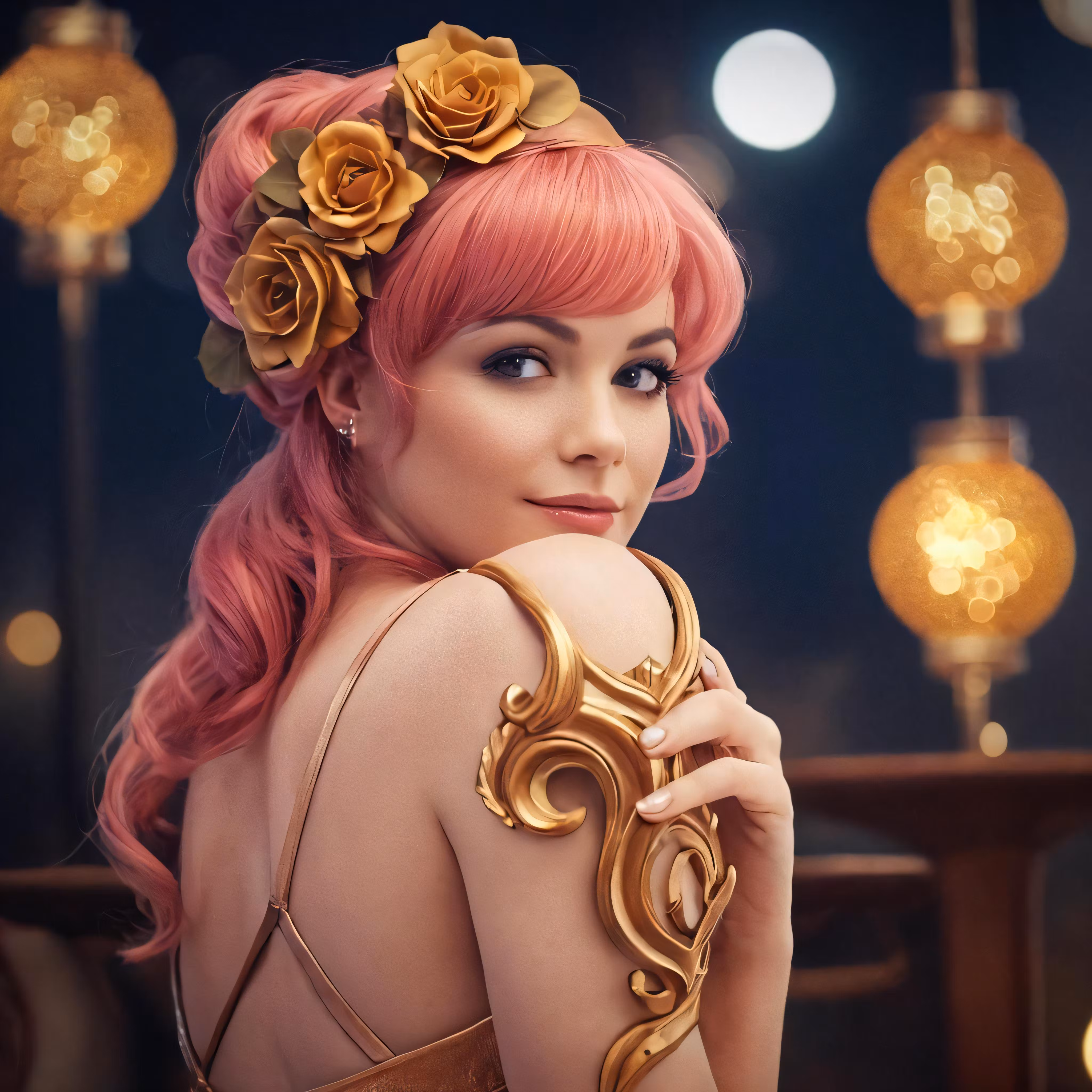 High resolution picture, free to use, a woman with pink hair and a gold flower in her hair