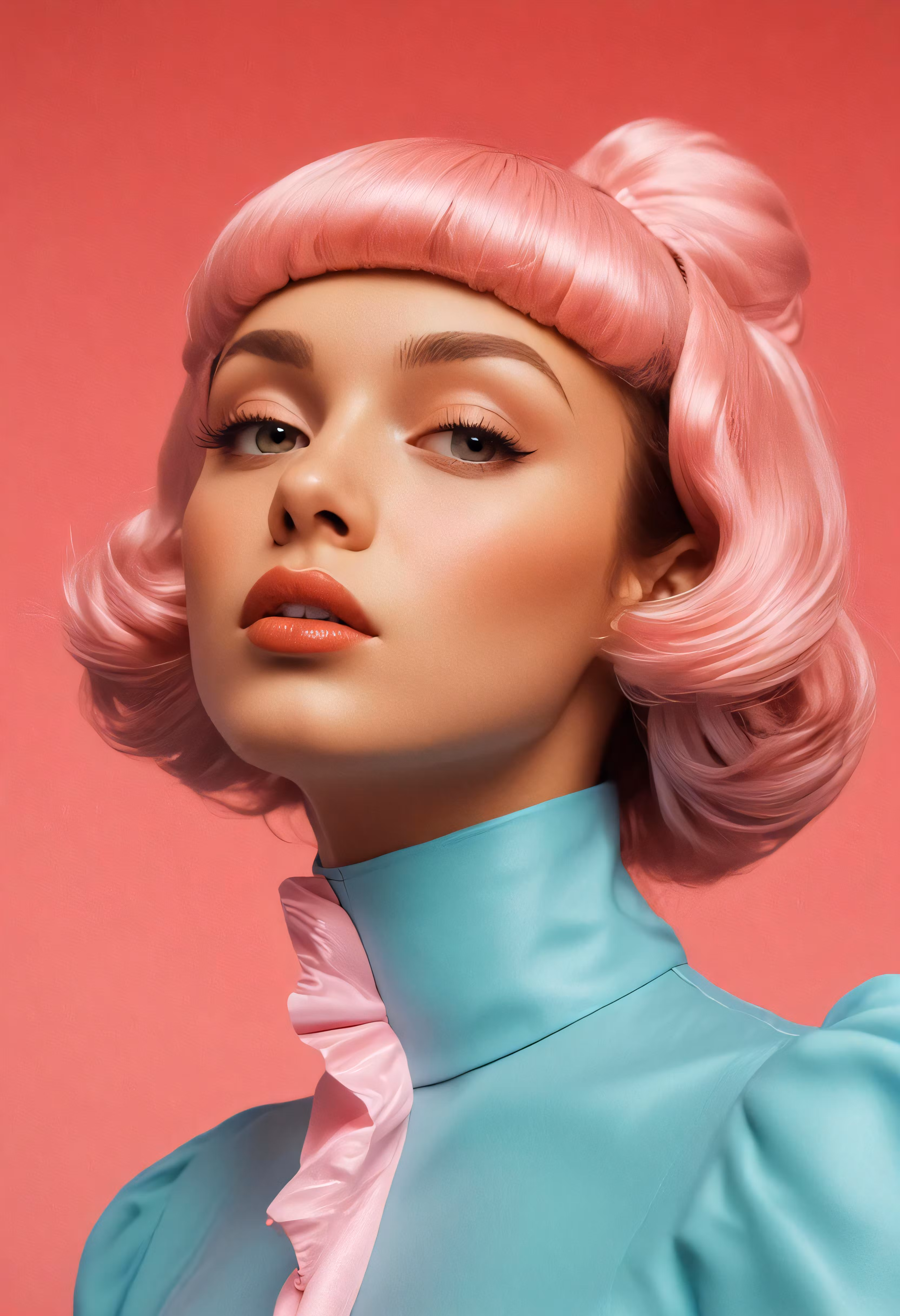 High resolution picture, free to use, a woman with pink hair is dressed up