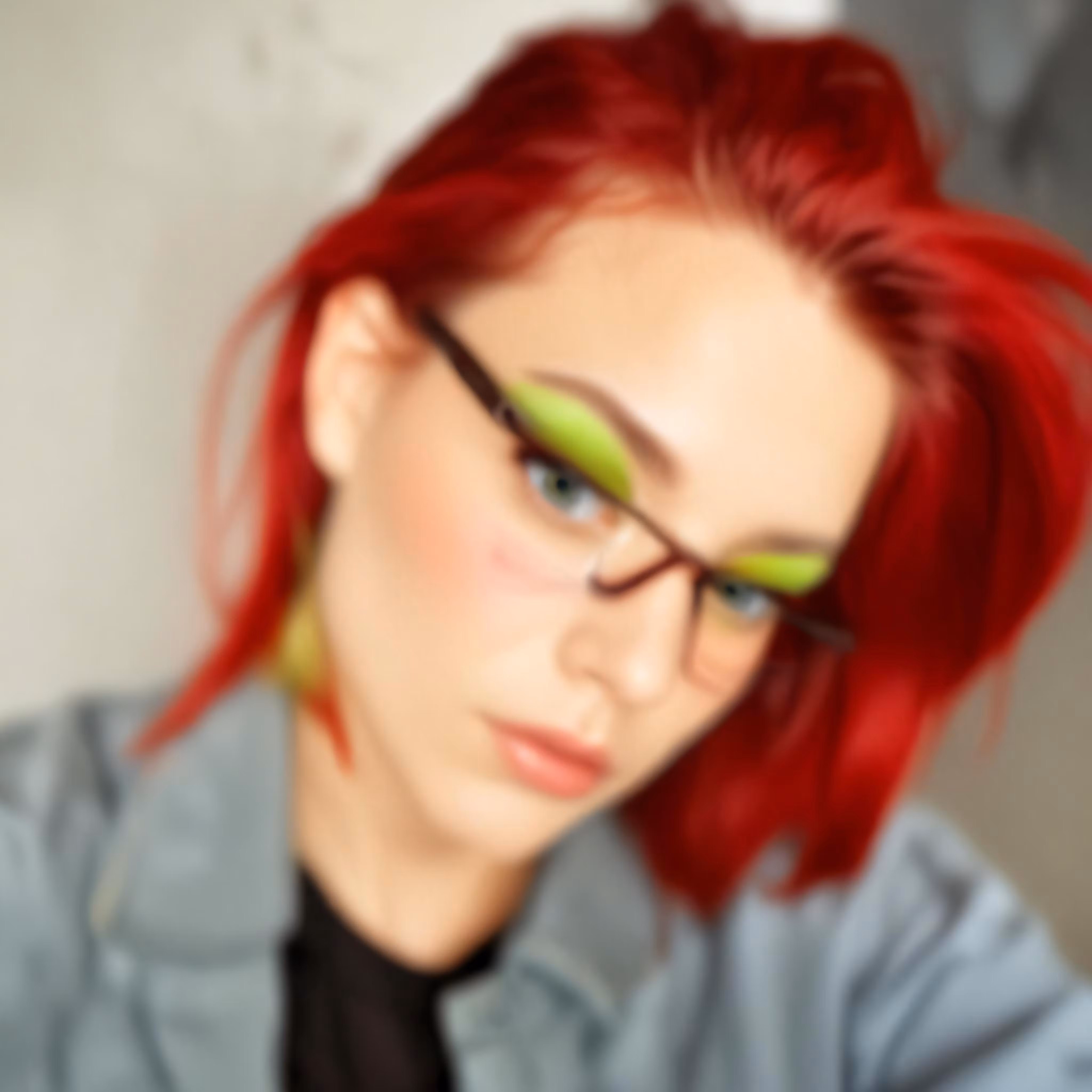 High resolution picture, free to use, a woman with red hair and glasses has bright green eye shadows