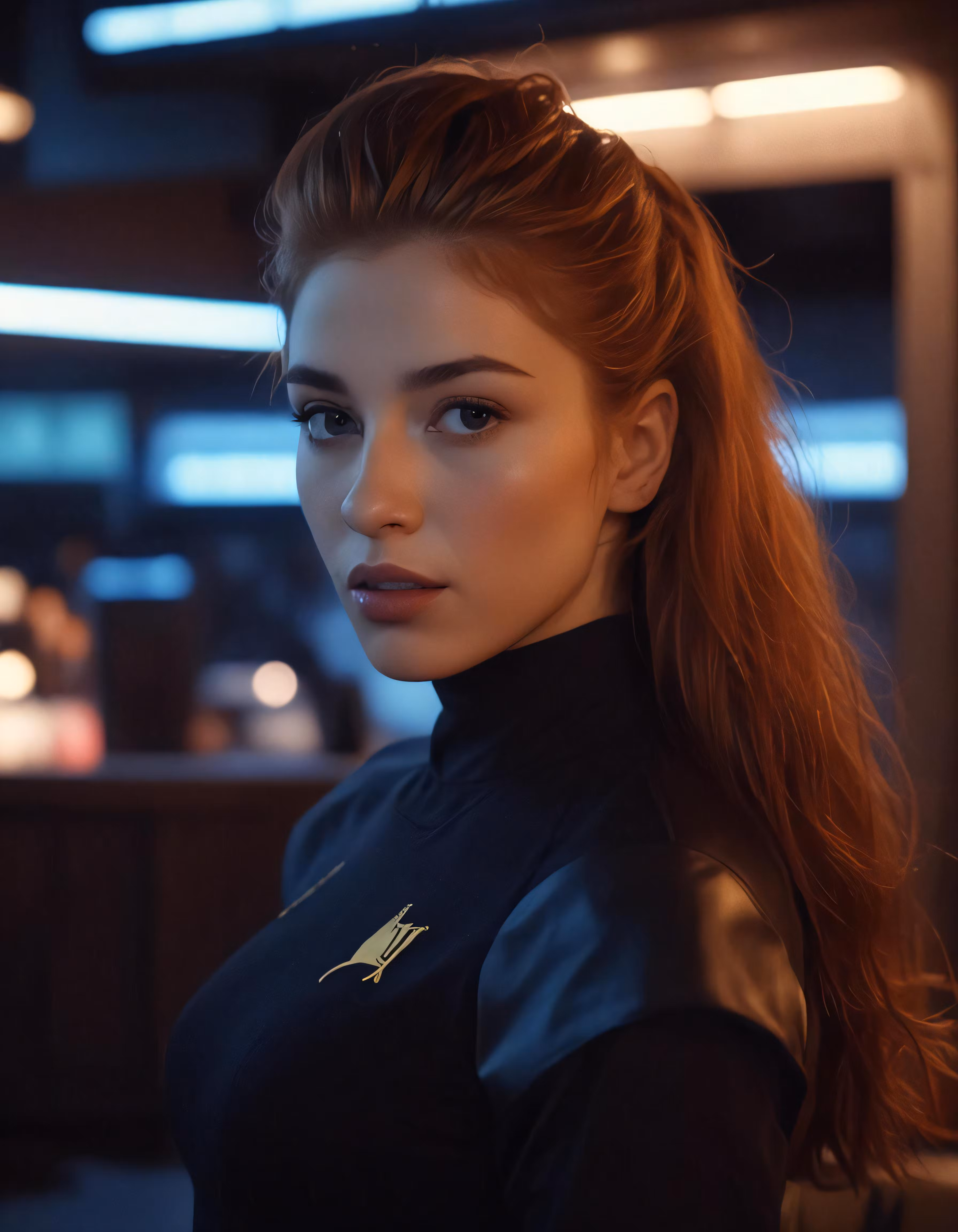 High resolution picture, free to use, a woman with red hair in a blue dress