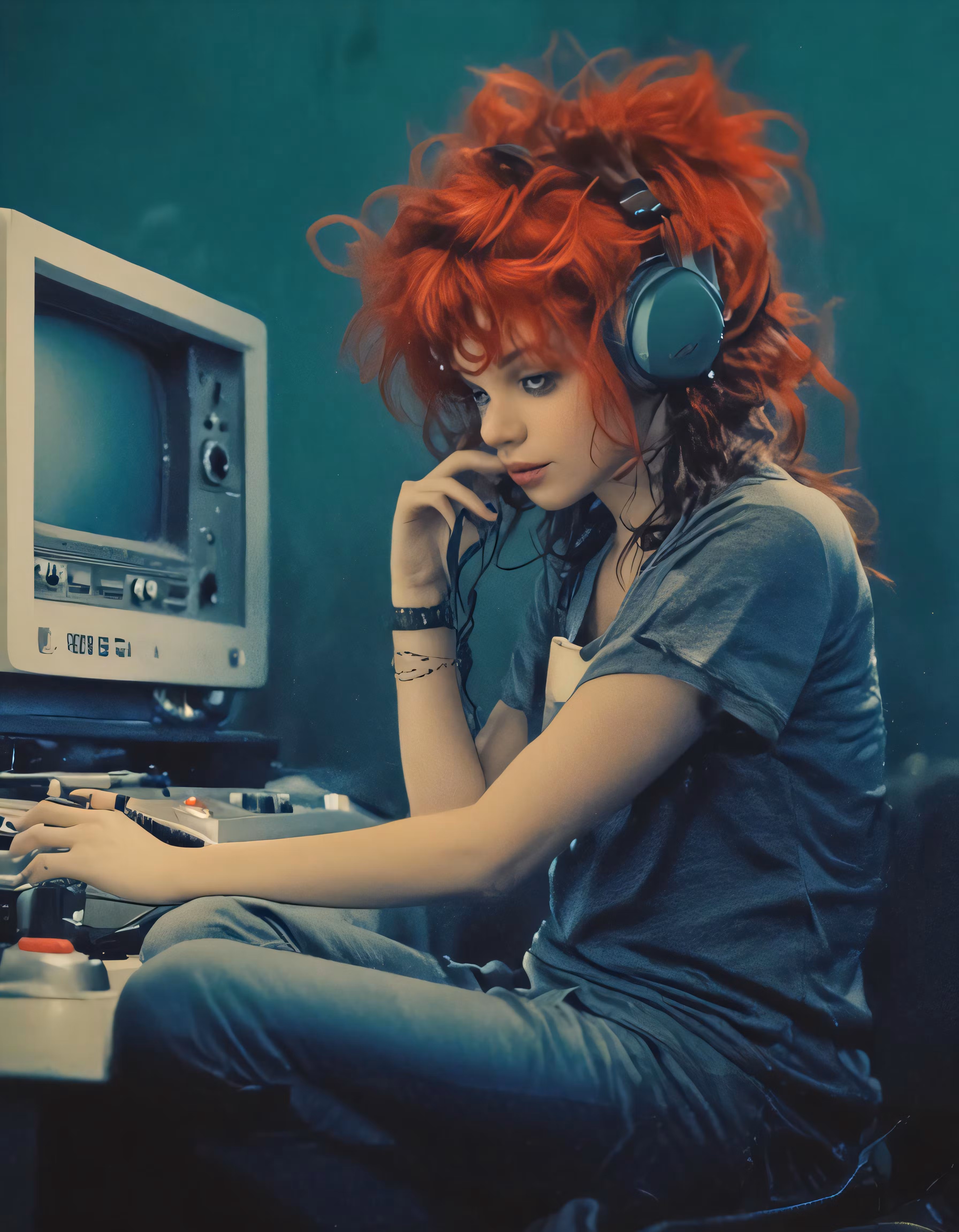 High resolution picture, free to use, a woman with red hair sitting at a computer
