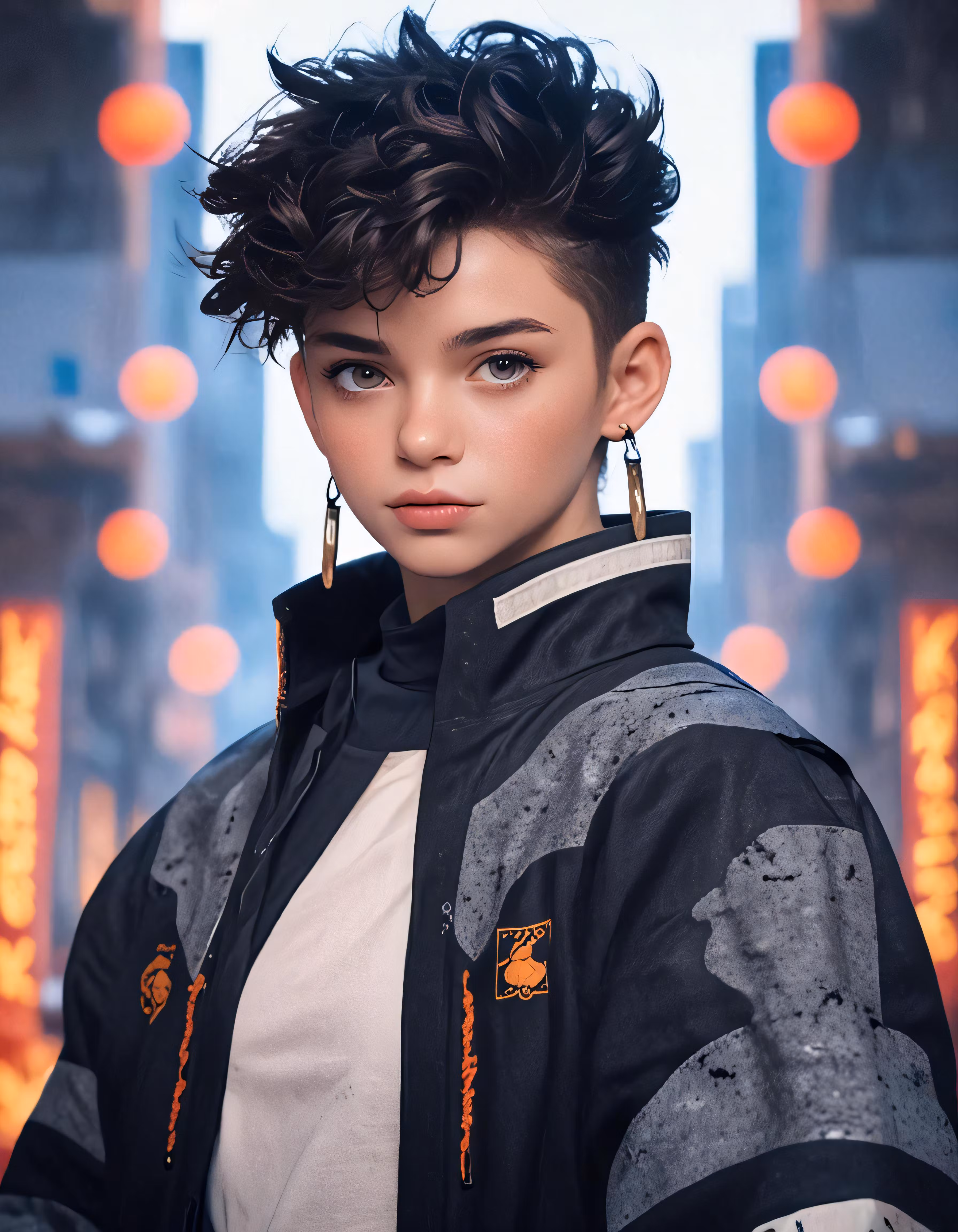 High resolution picture, free to use, a woman with short dark hair standing in front of a city