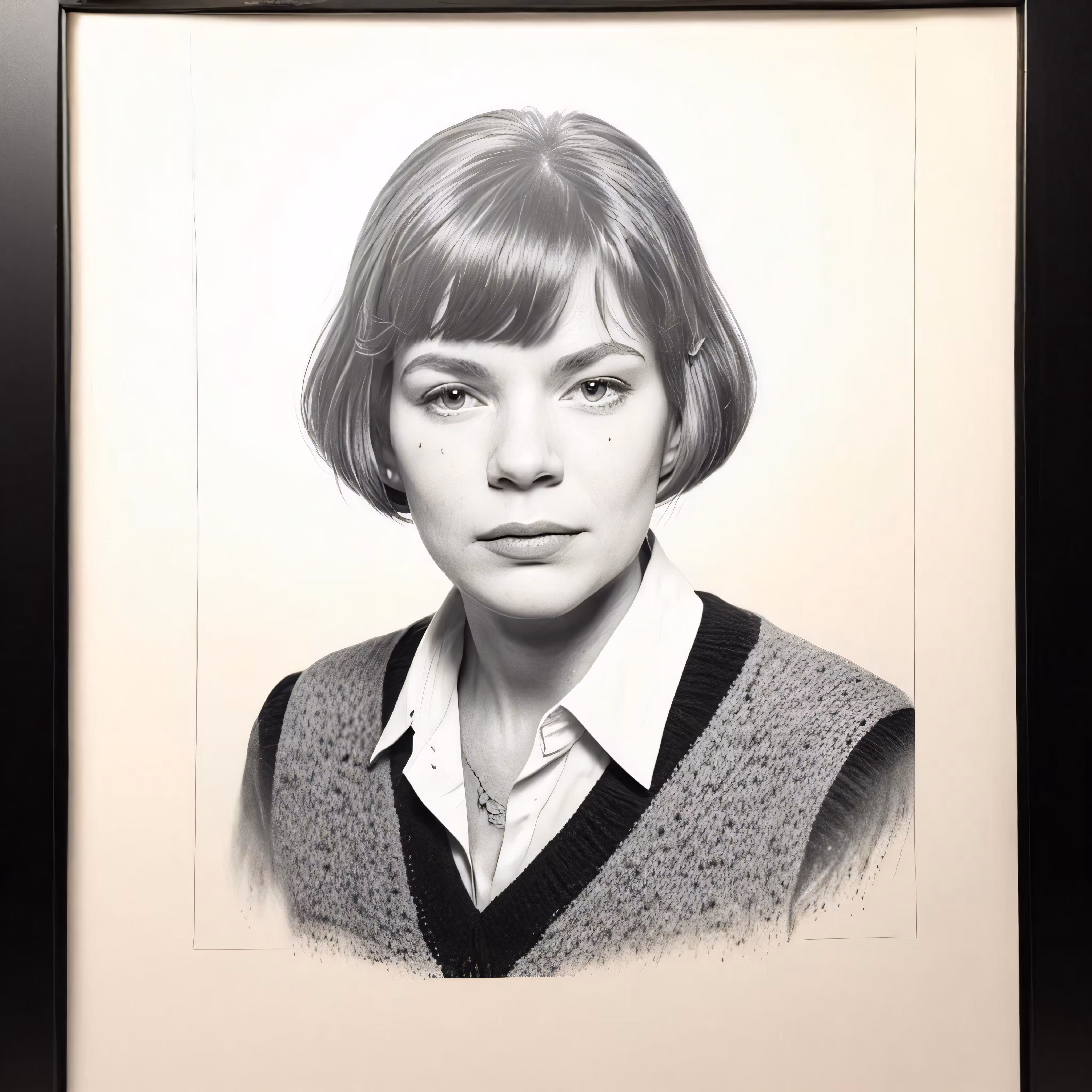 High resolution picture, free to use, a woman with short hair and bangs in a black frame