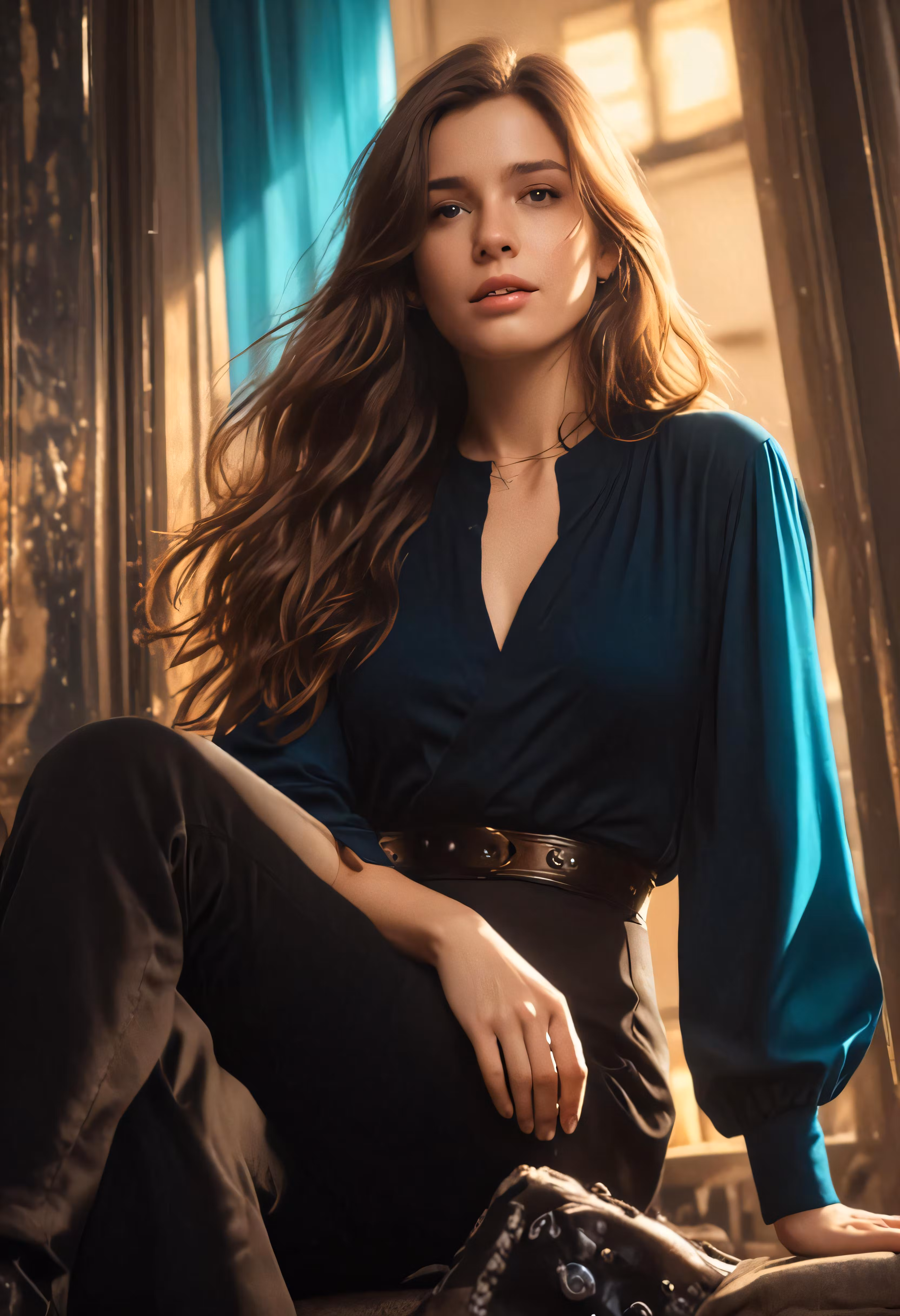 High resolution picture, free to use, a woman with very long, wavy hair, wearing a top and brown pants