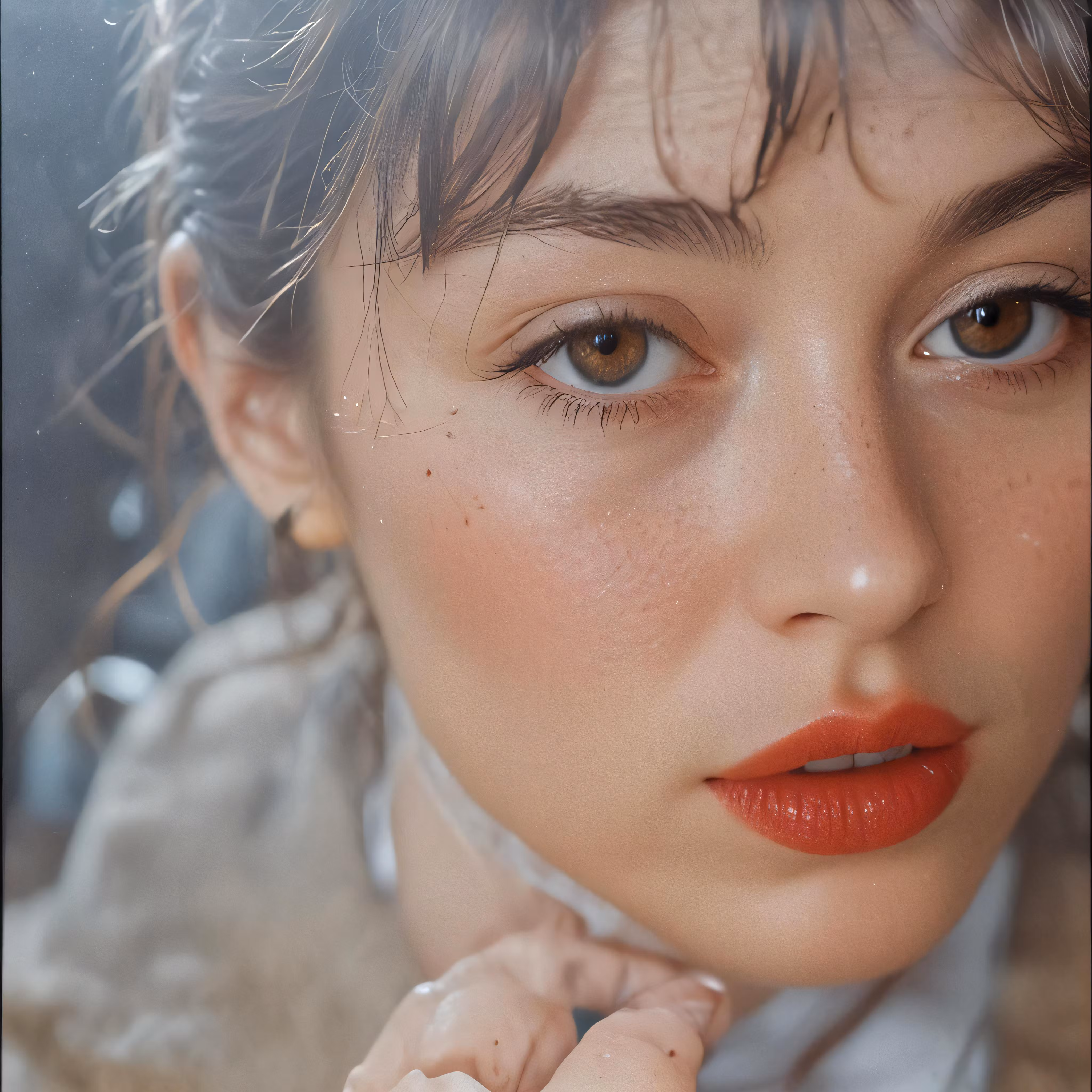 High resolution picture, free to use, a woman with wavy hair and orange lipstick is wearing a white shirt