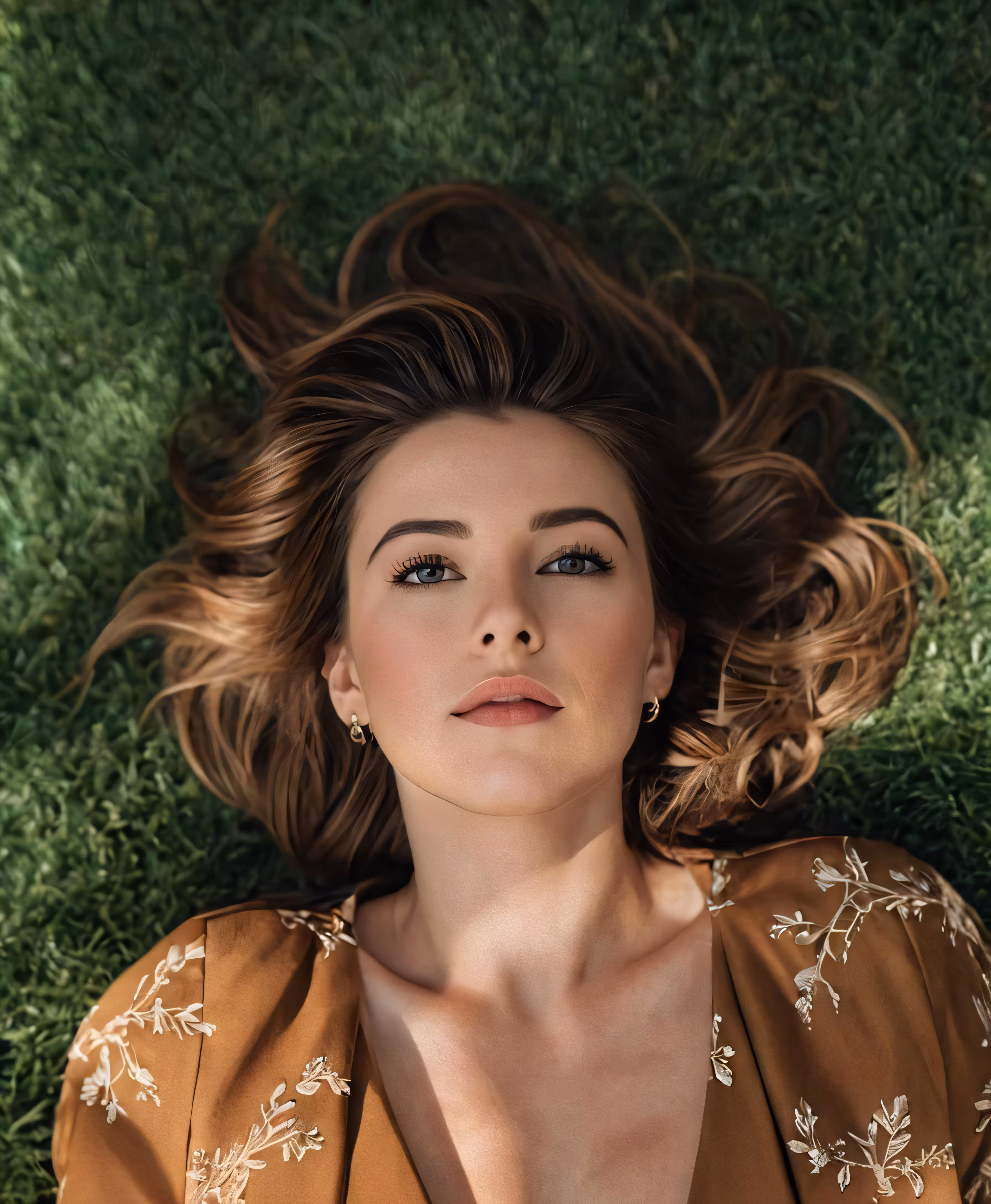 High resolution picture, free to use, a woman with wavy hair is lying in grass