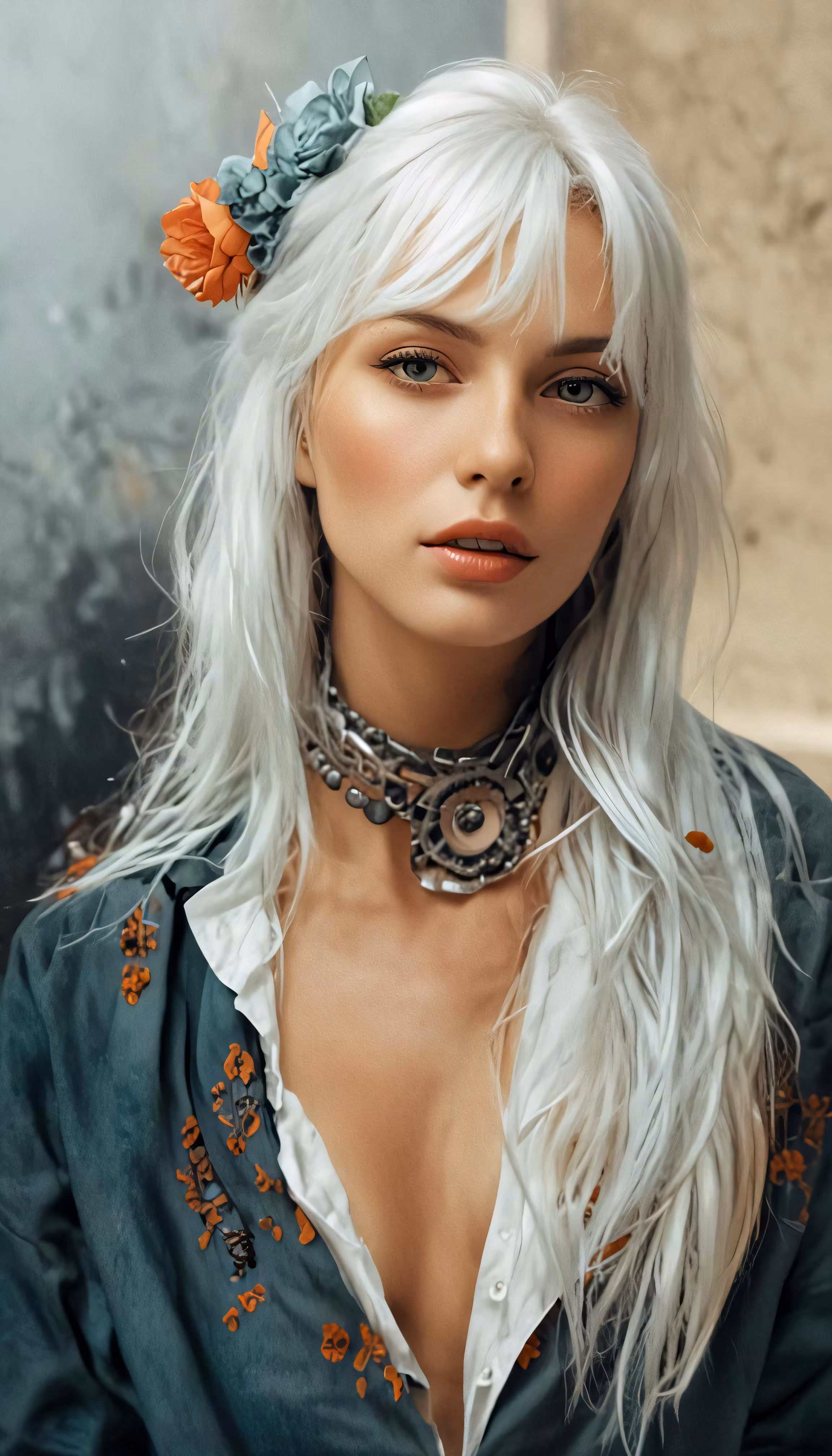 High resolution picture, free to use, a woman with white hair and a necklace with orange flowers