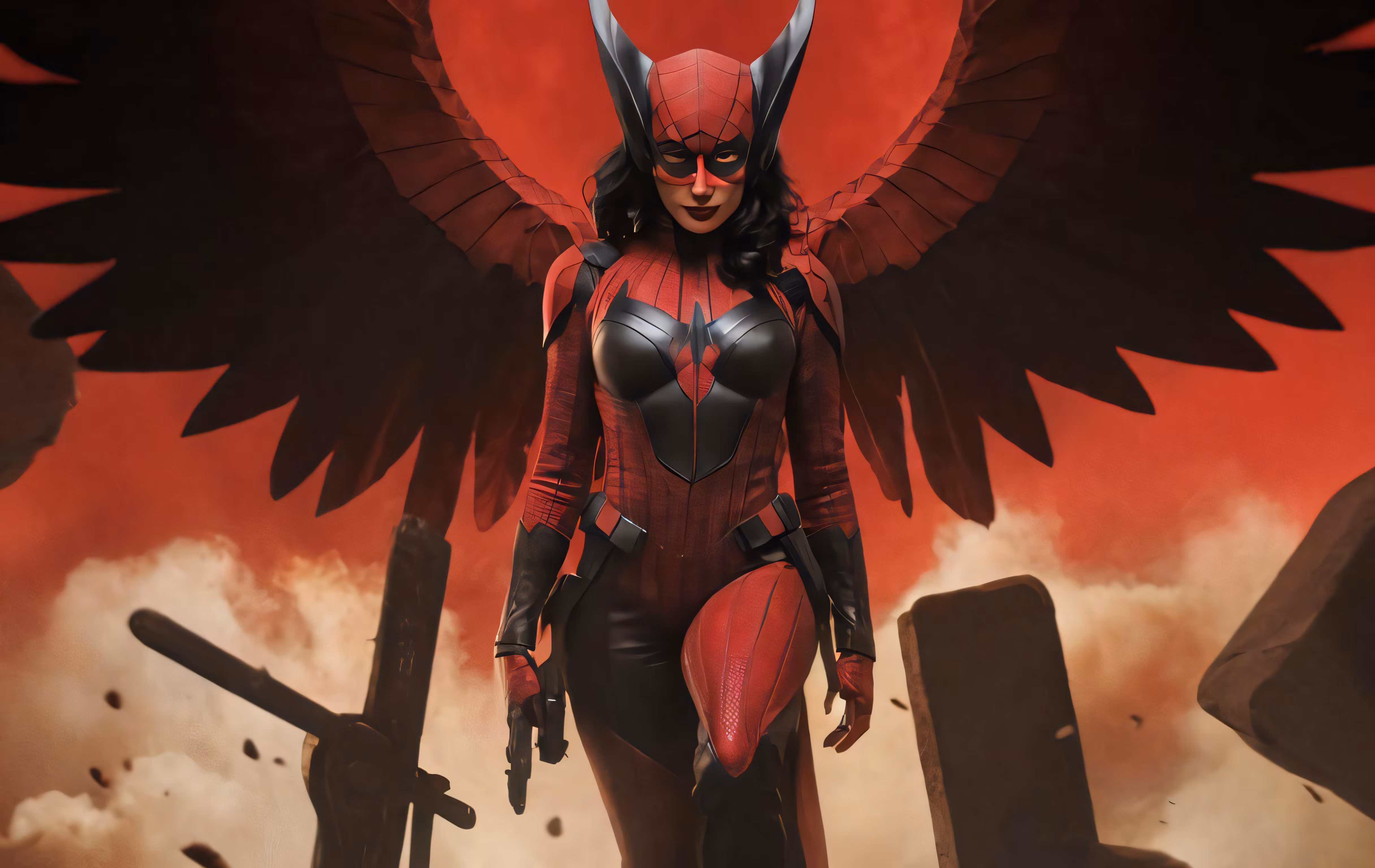 High resolution picture, free to use, a woman with wings standing in front of some guns