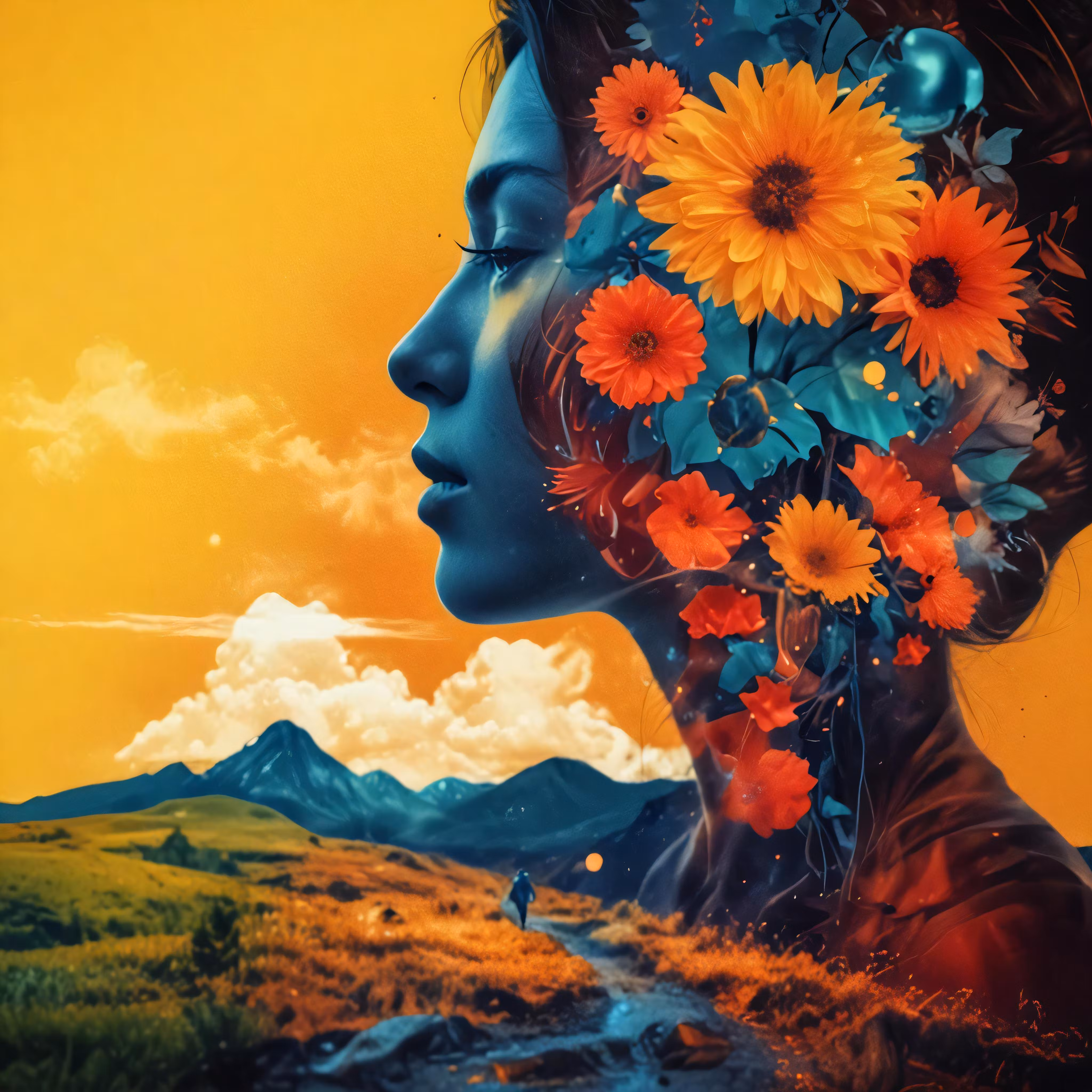 High resolution picture, free to use, a woman with yellow flowers in her head and landscape