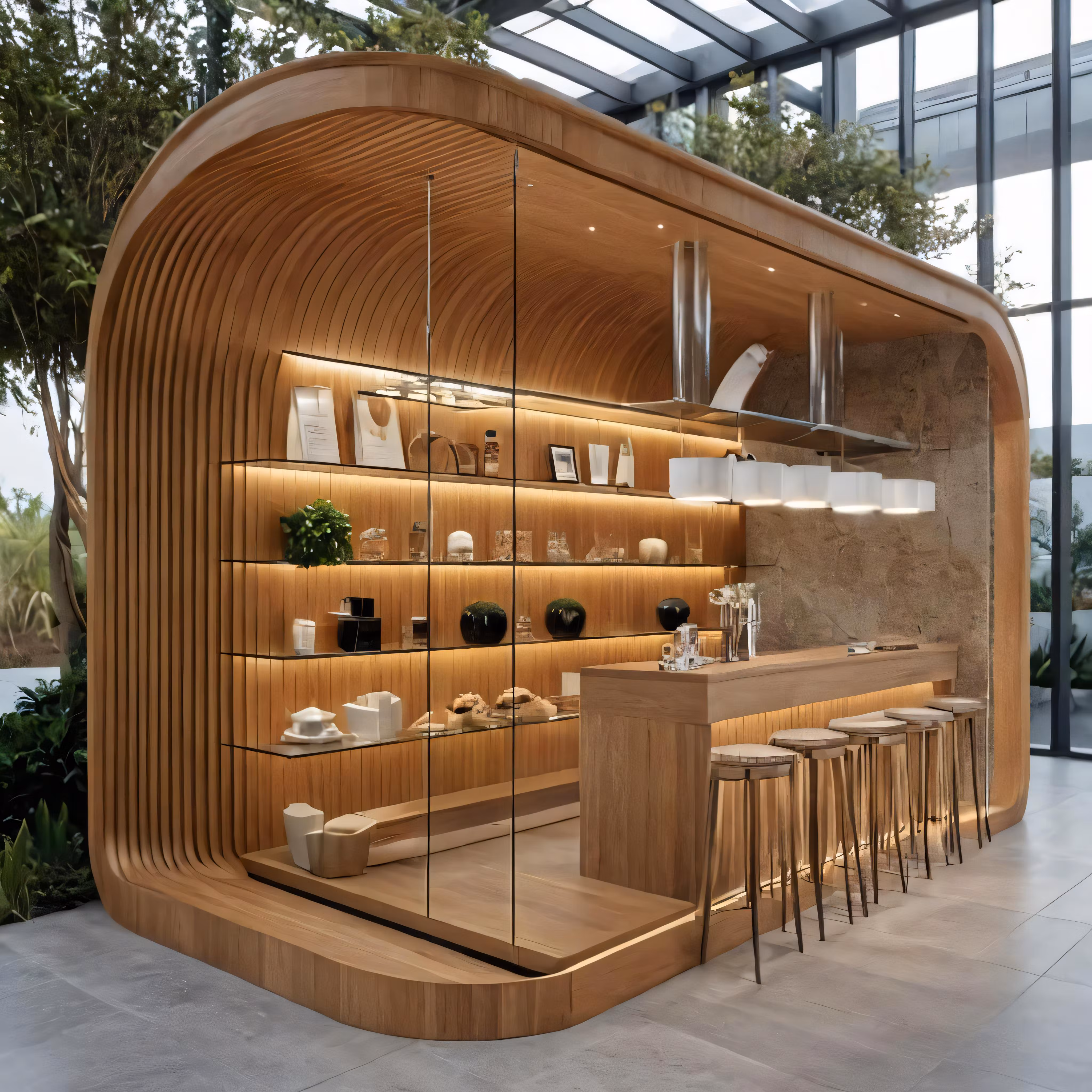 High resolution picture, free to use, a wood and glass kitchen with a counter and bar