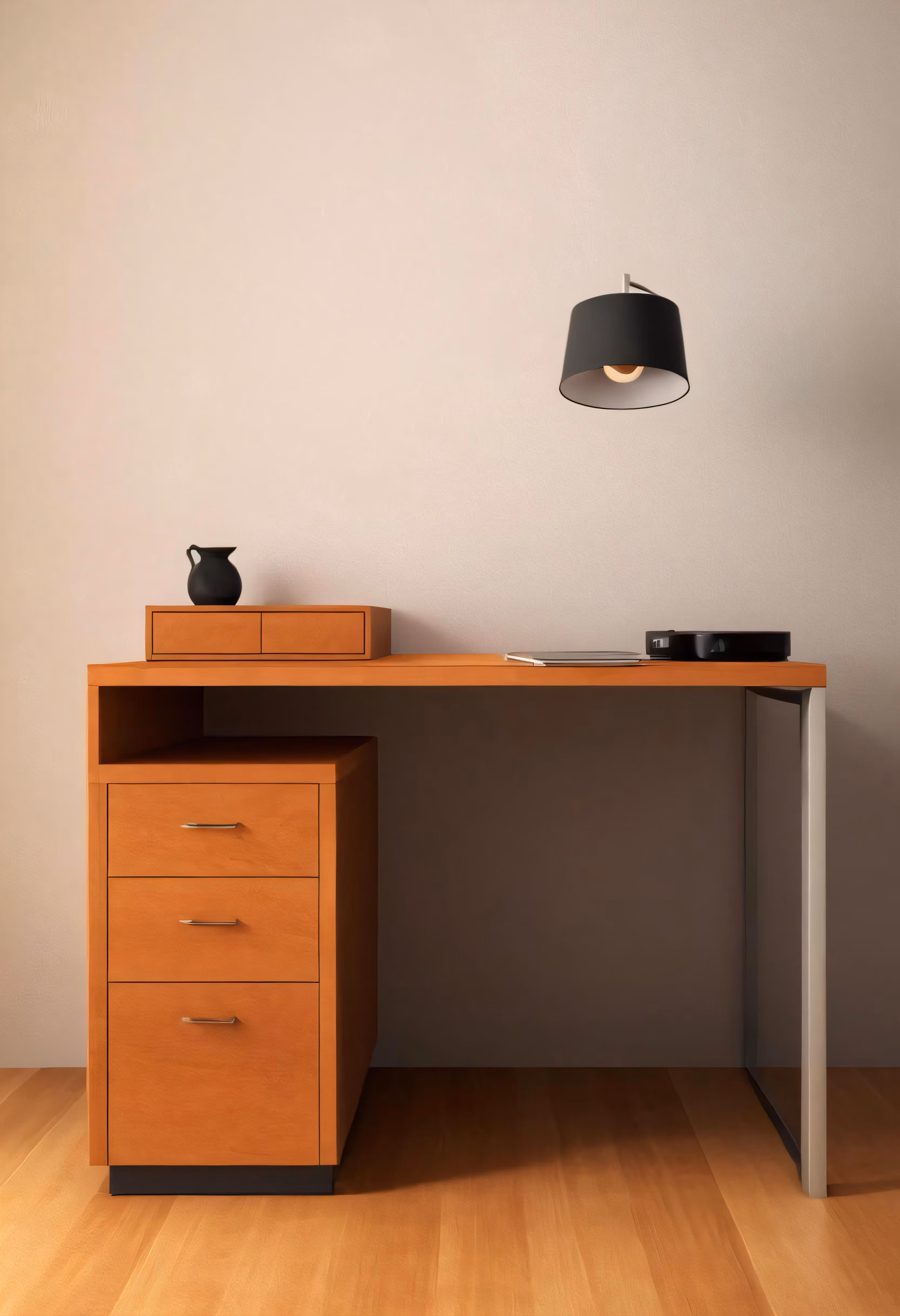 High resolution picture, free to use, a wood desk with a lamp on top of it