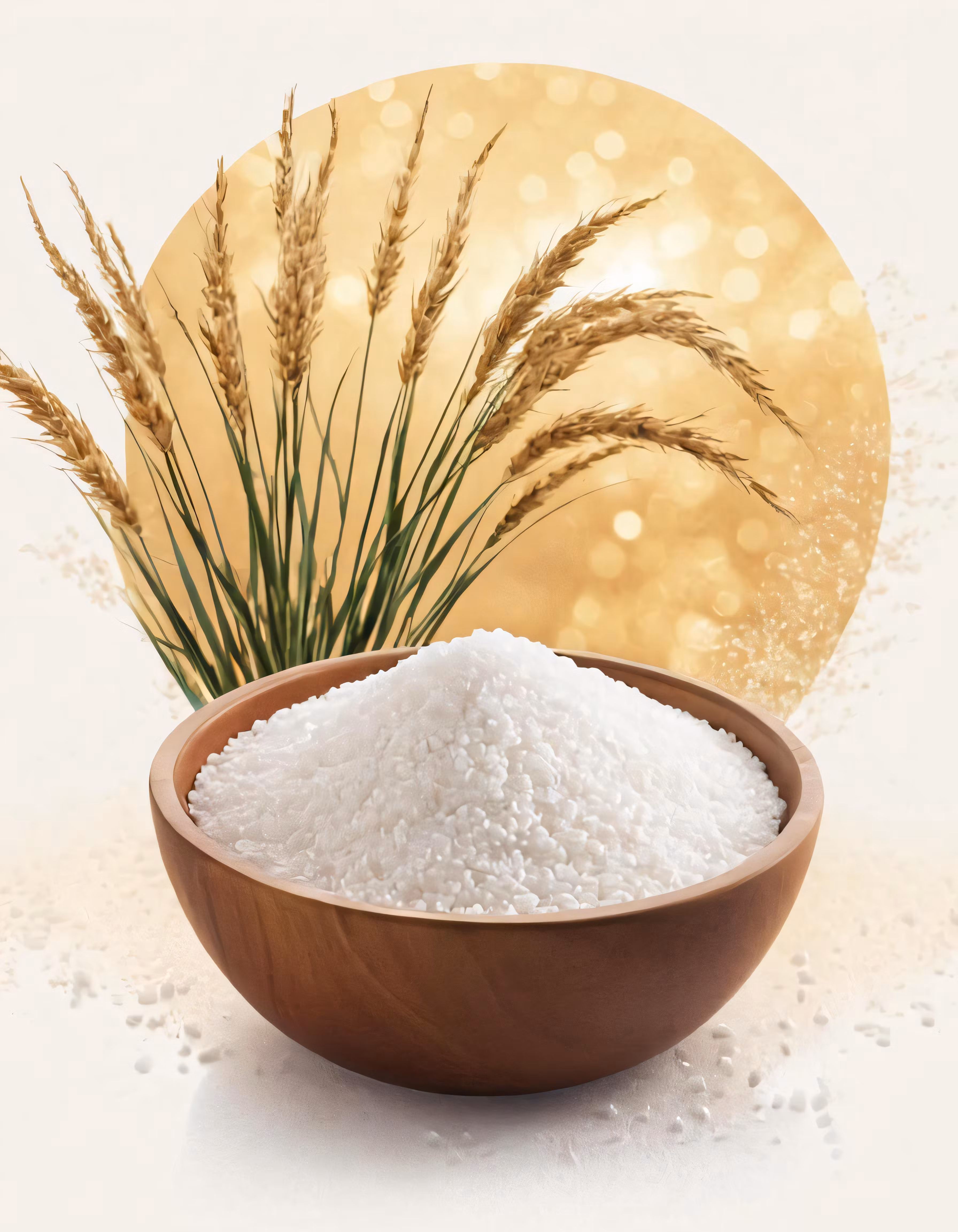 High resolution picture, free to use, a wooden bowl filled with sugar next to pamphini and grasses