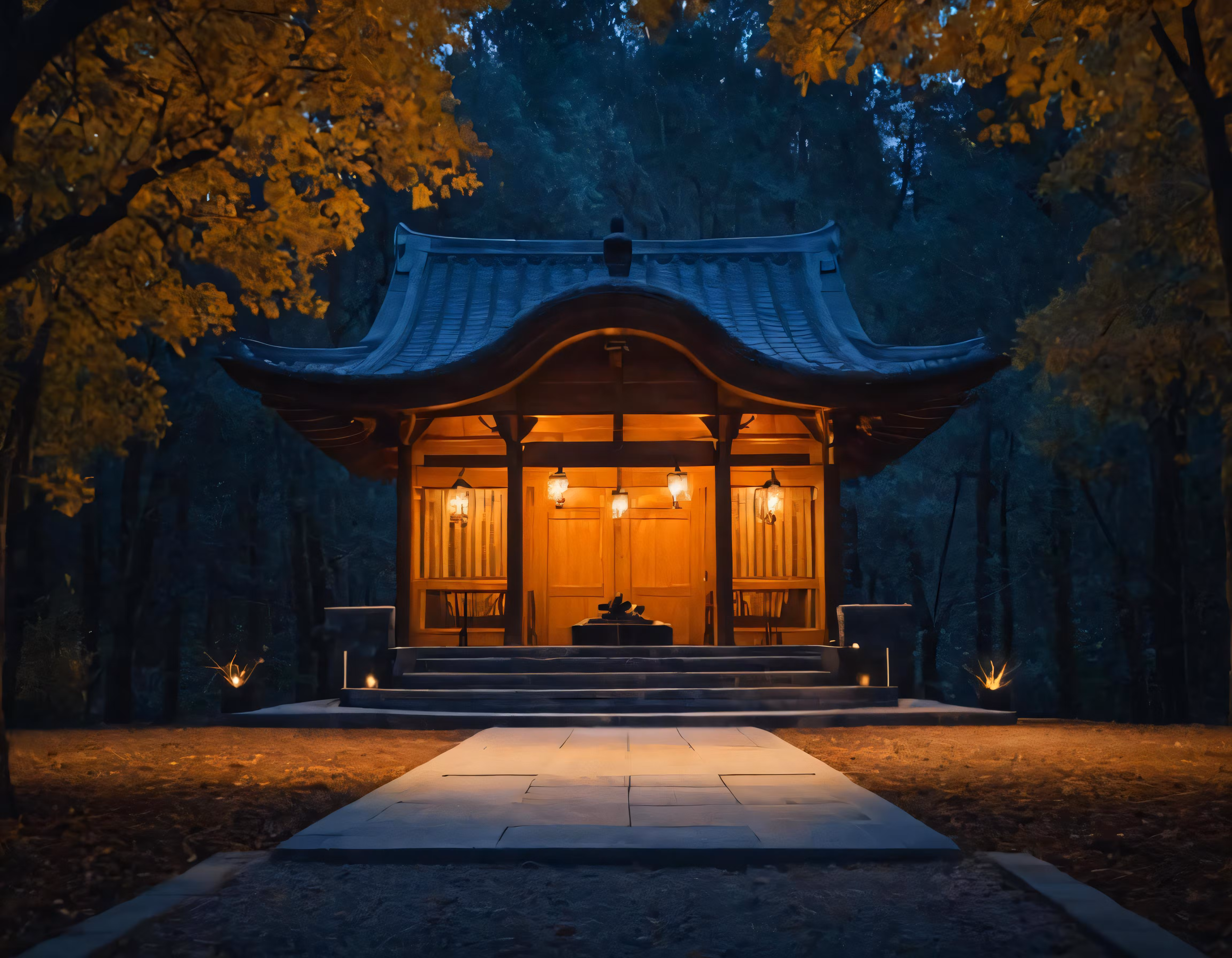 High resolution picture, free to use, a wooden building with lights on and an arch in front