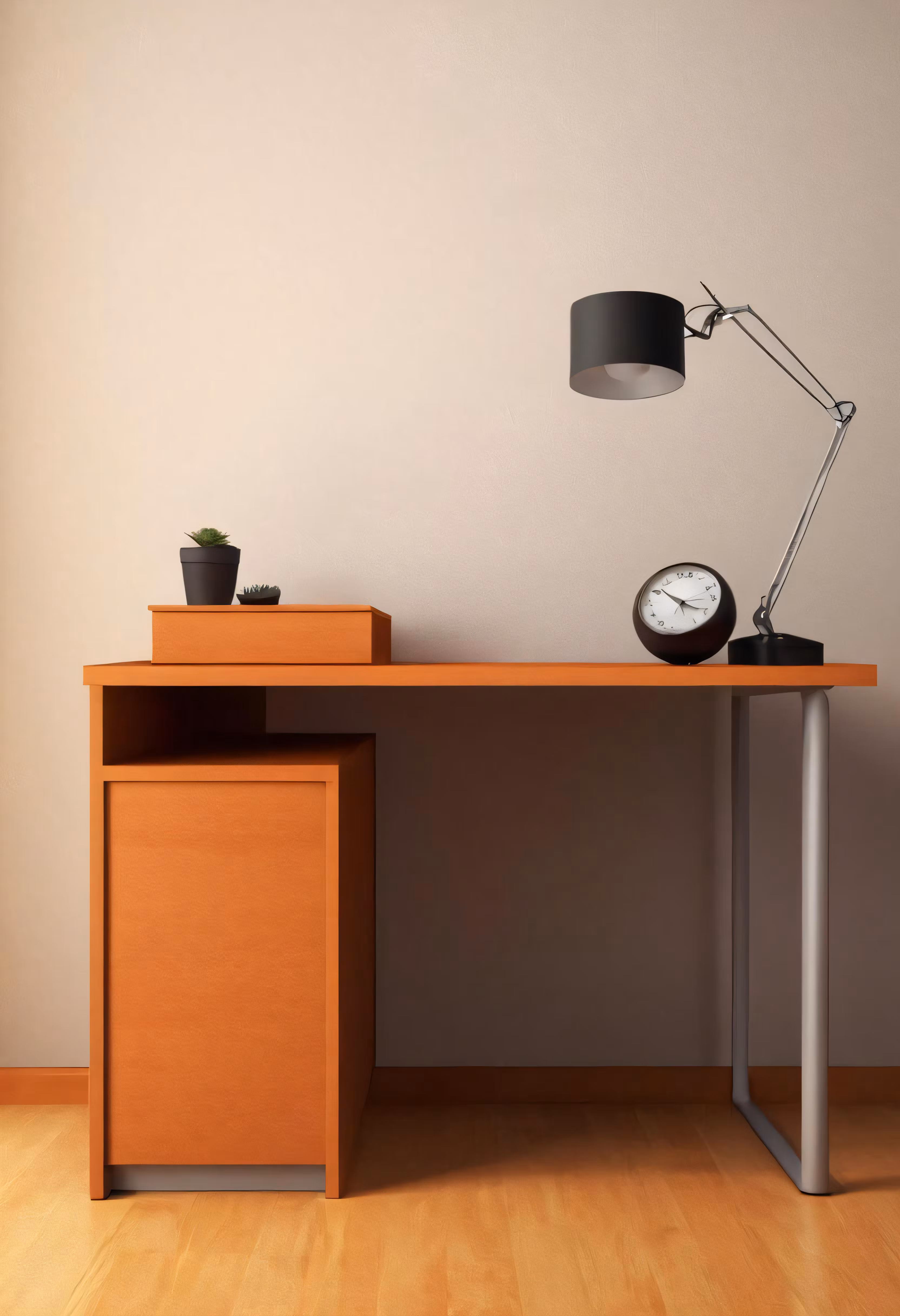 High resolution picture, free to use, a wooden desk topped with a clock and lamp