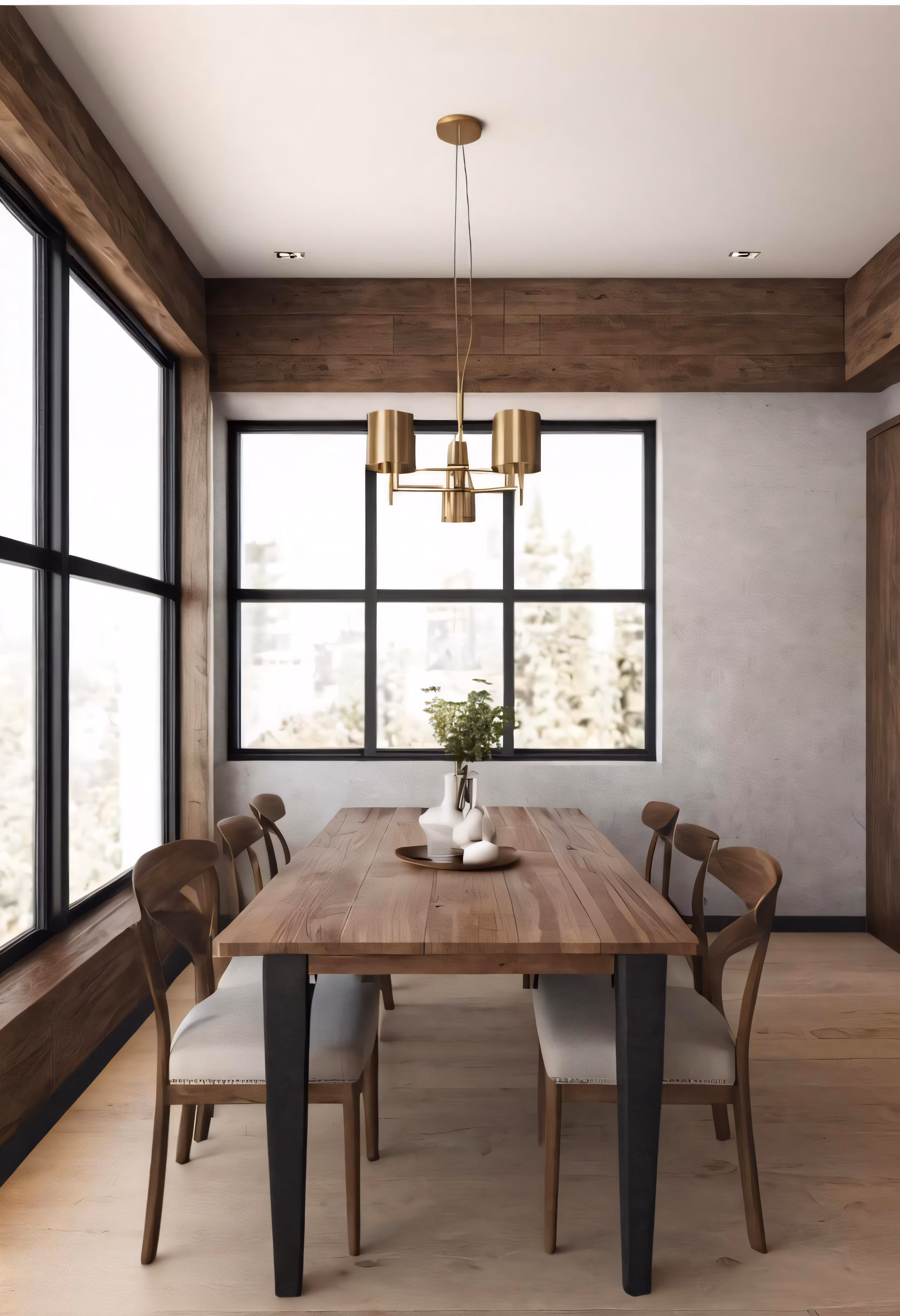 High resolution picture, free to use, a wooden dining table surrounded by two hanging lamps