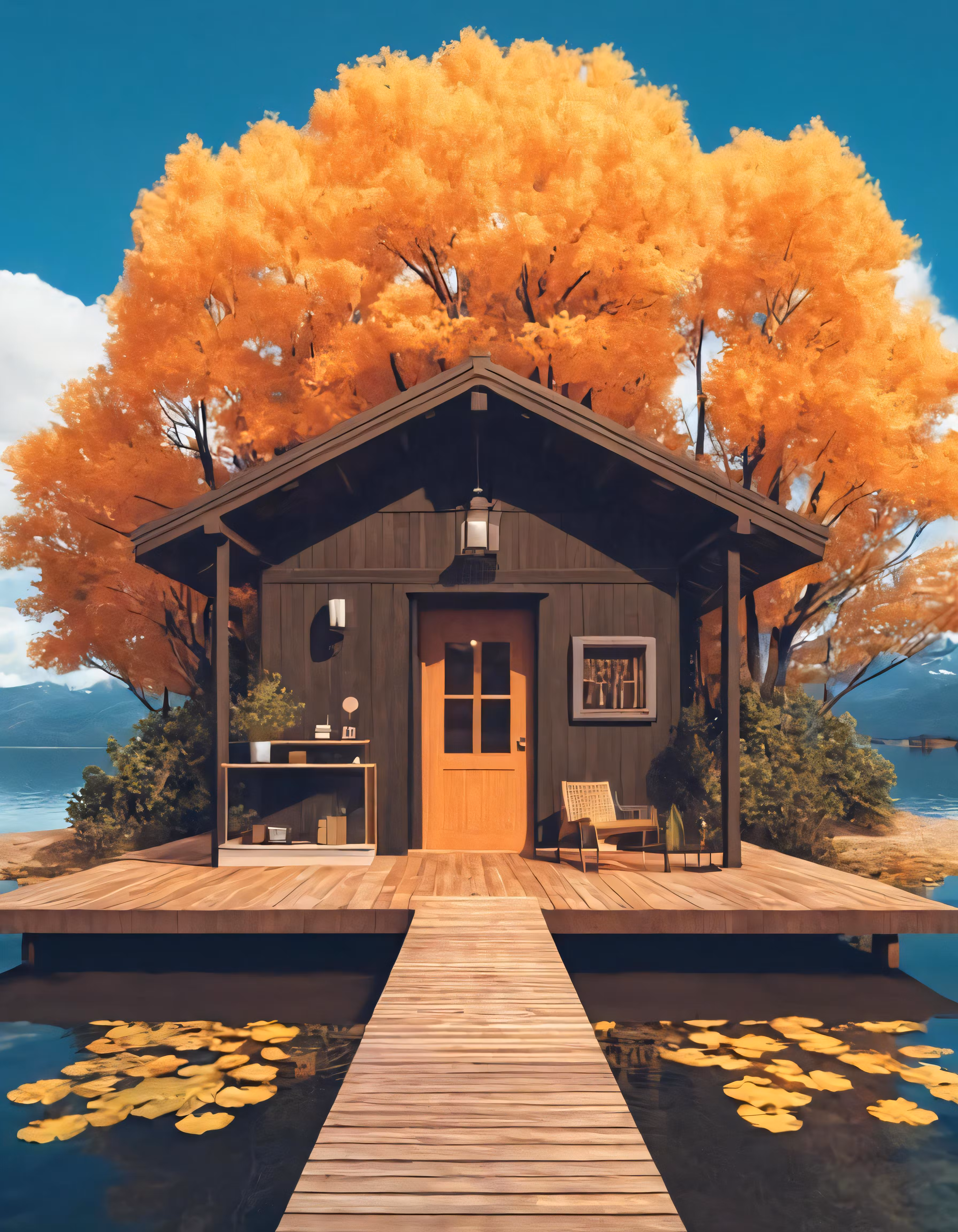 High resolution picture, free to use, a wooden dock extends to the front porch of an elegant, tiny house