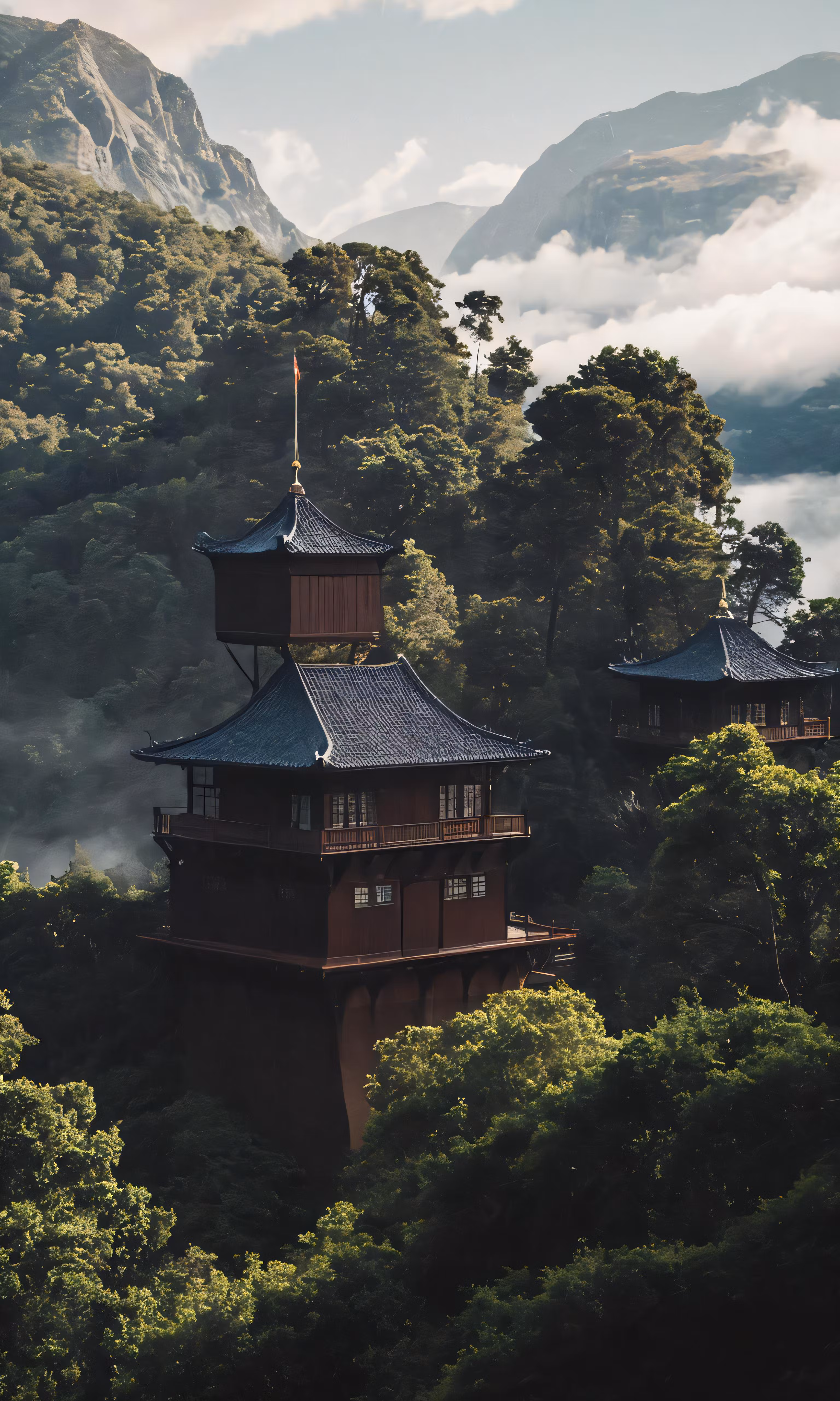 High resolution picture, free to use, a wooden structure sitting in the middle of lush green forest