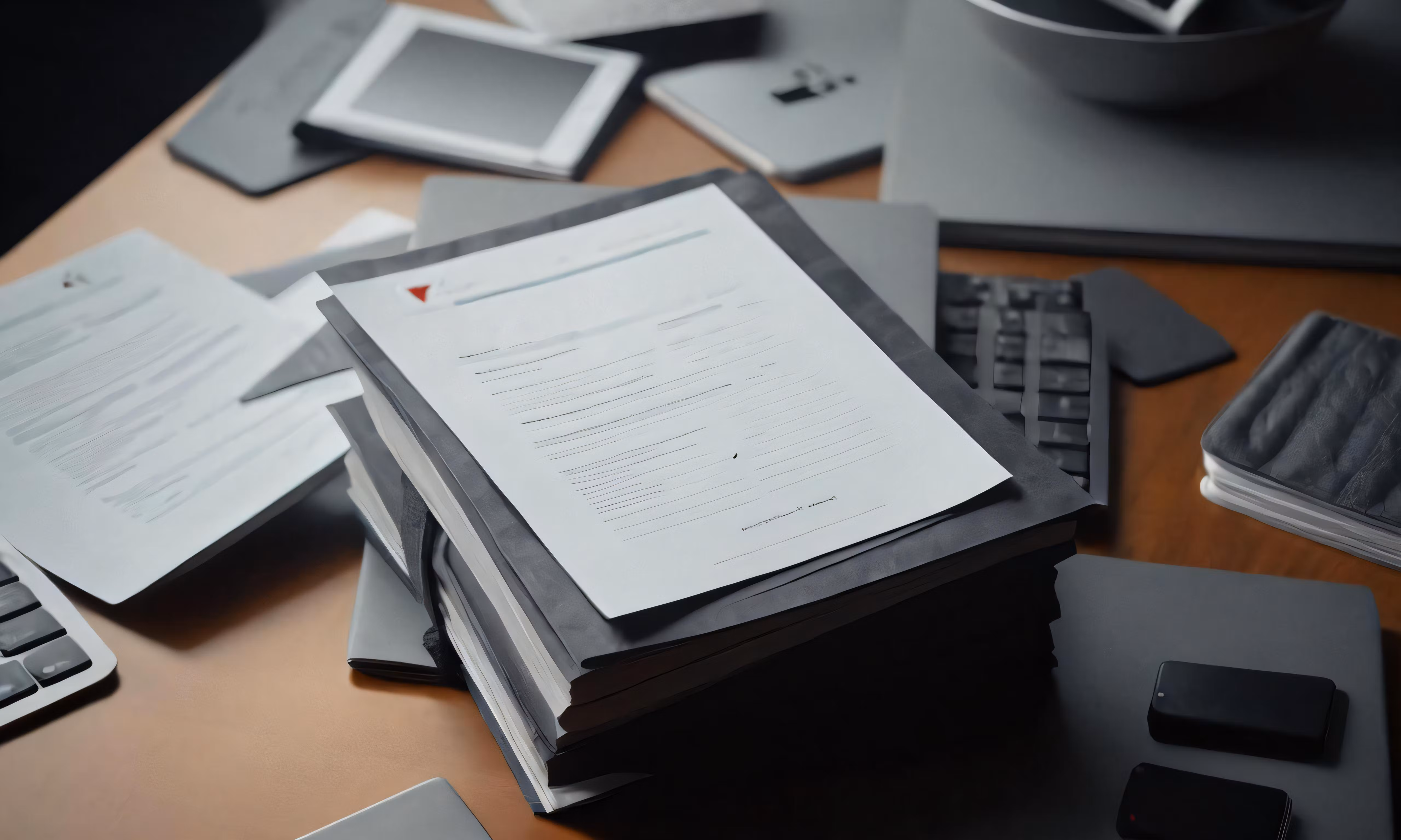 High resolution picture, free to use, a wooden table with multiple papers and computers on top