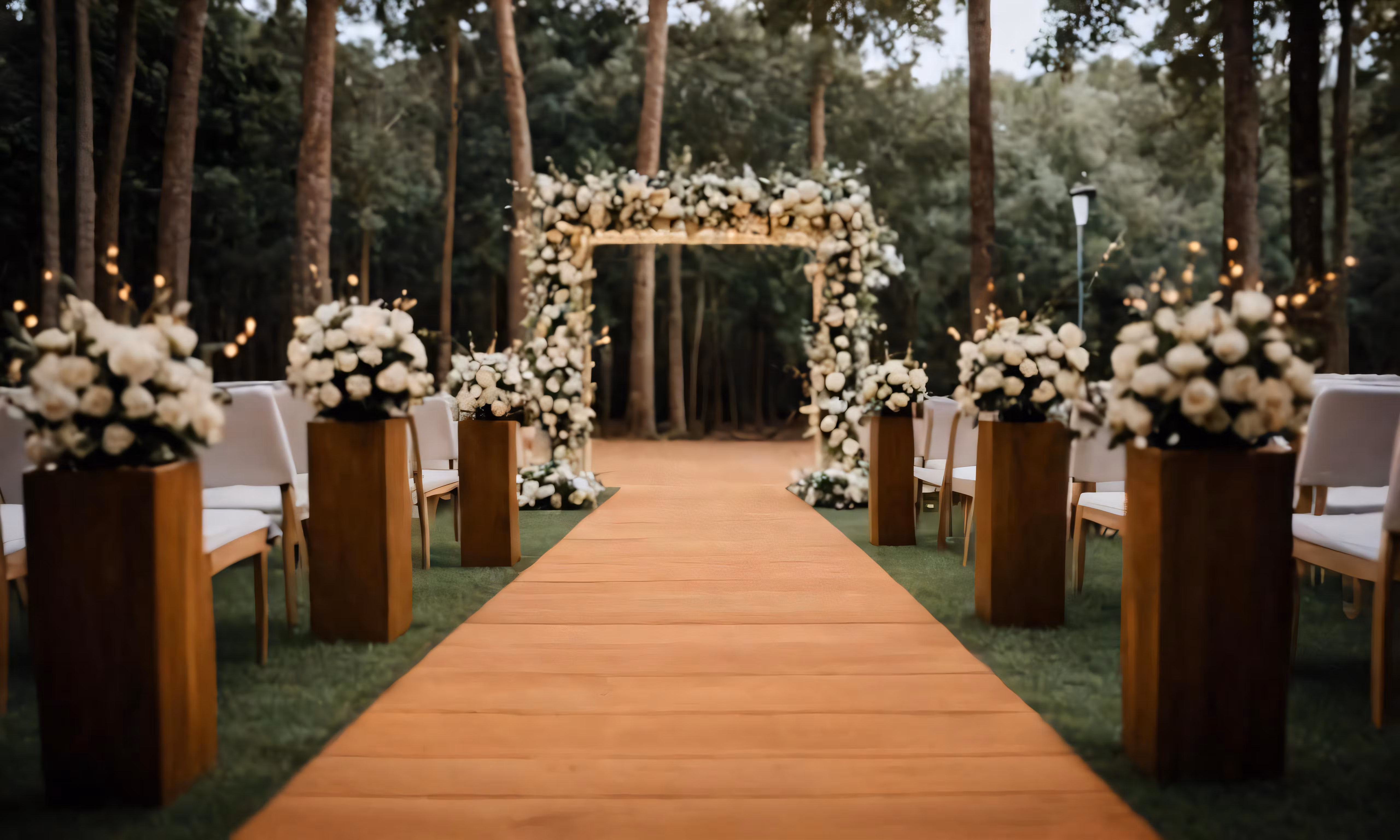 High resolution picture, free to use, a wooden walkway lined with white flowers and candles