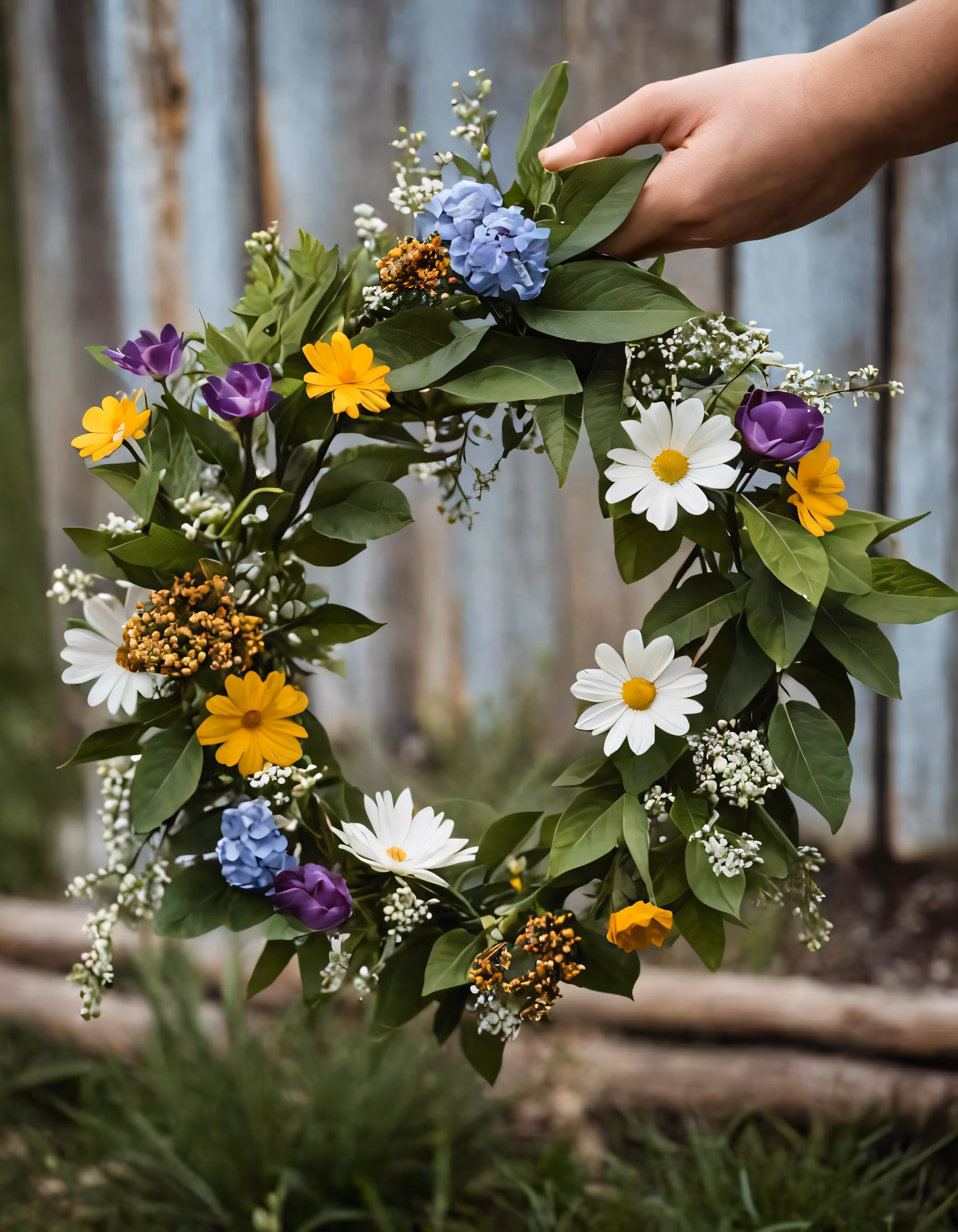 High resolution picture, free to use, a wreath is arranged in front of a weathered wooden fence