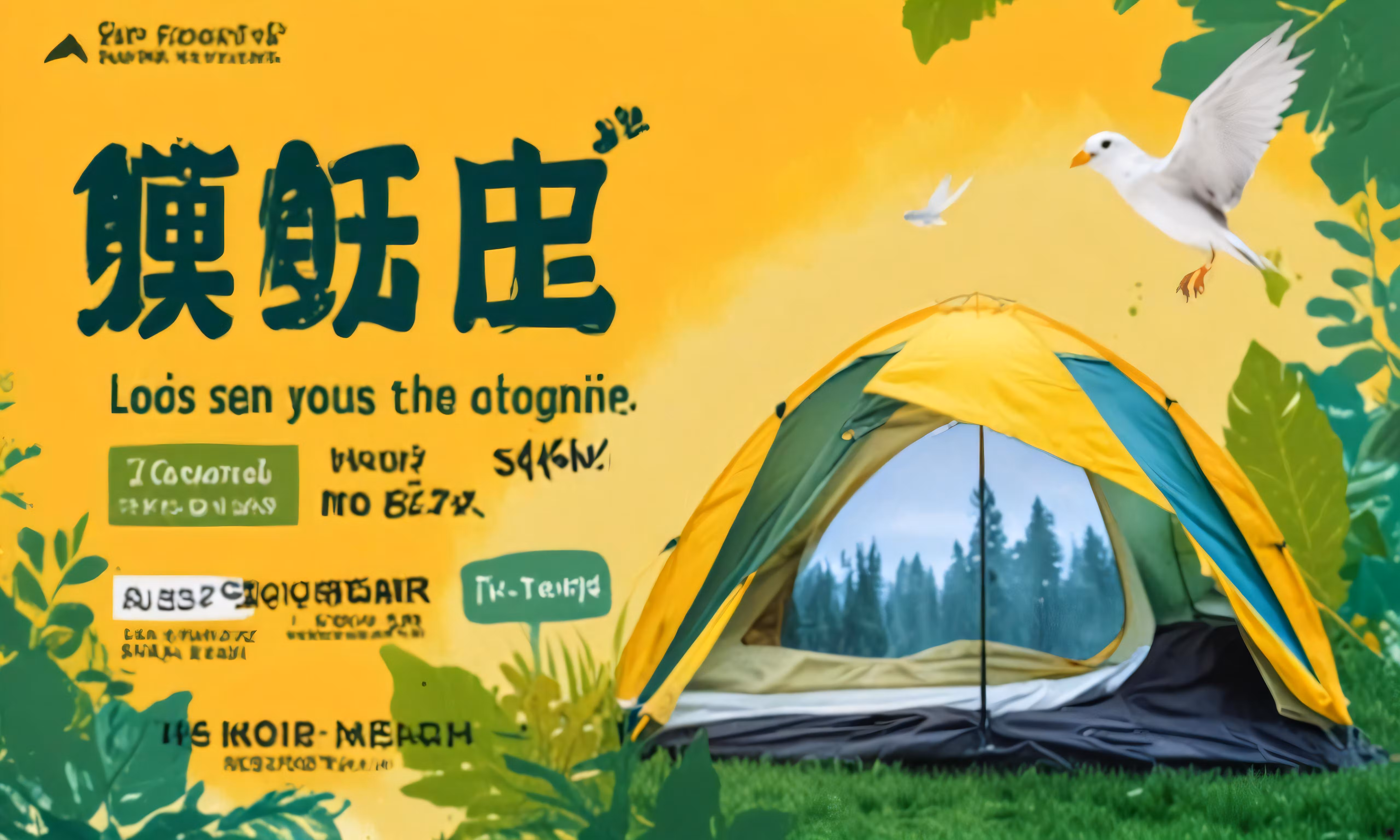 High resolution picture, free to use, a yellow and blue tent with green plants and birds