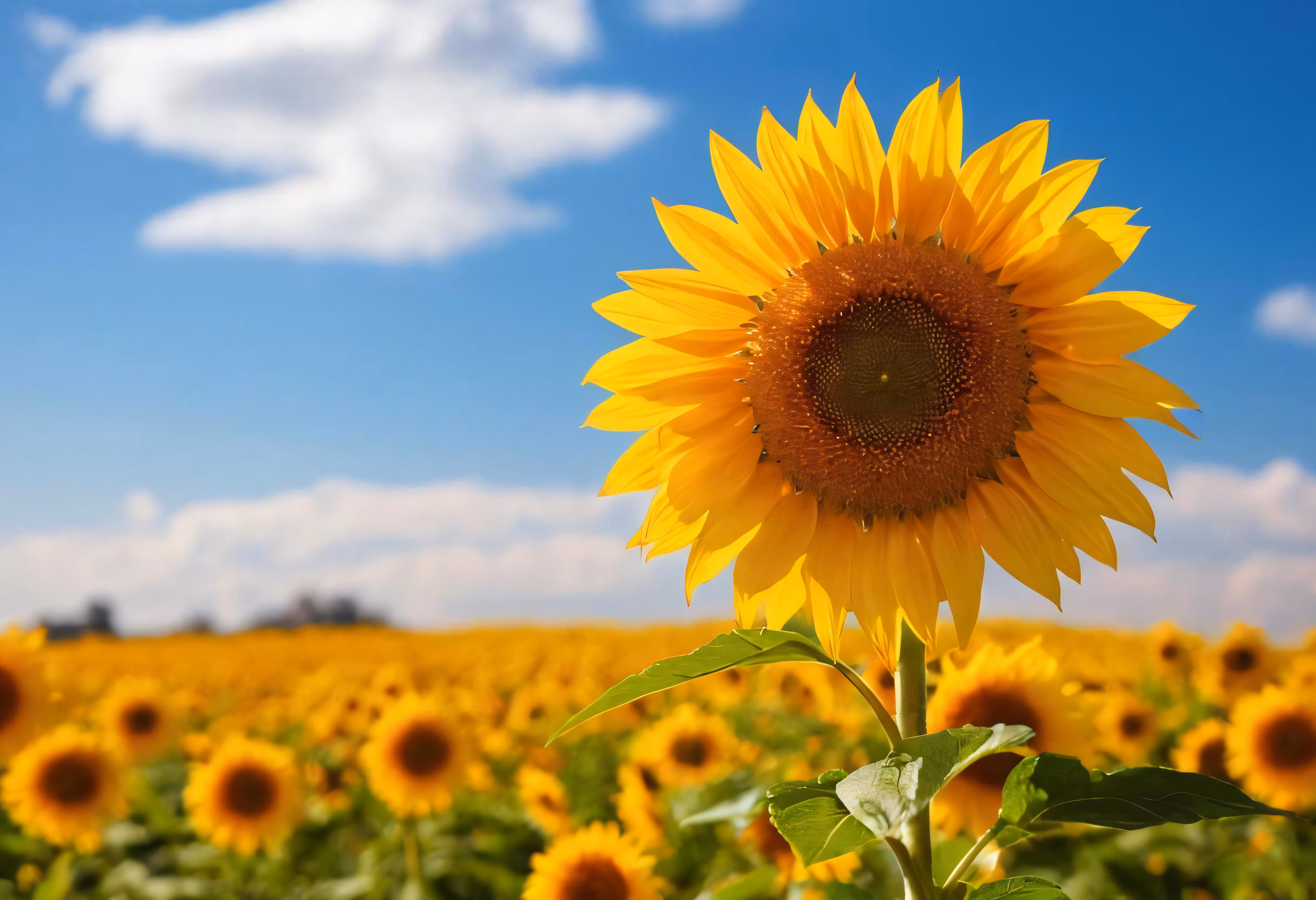 High resolution picture, free to use, a yellow sunflower in the middle of a big field