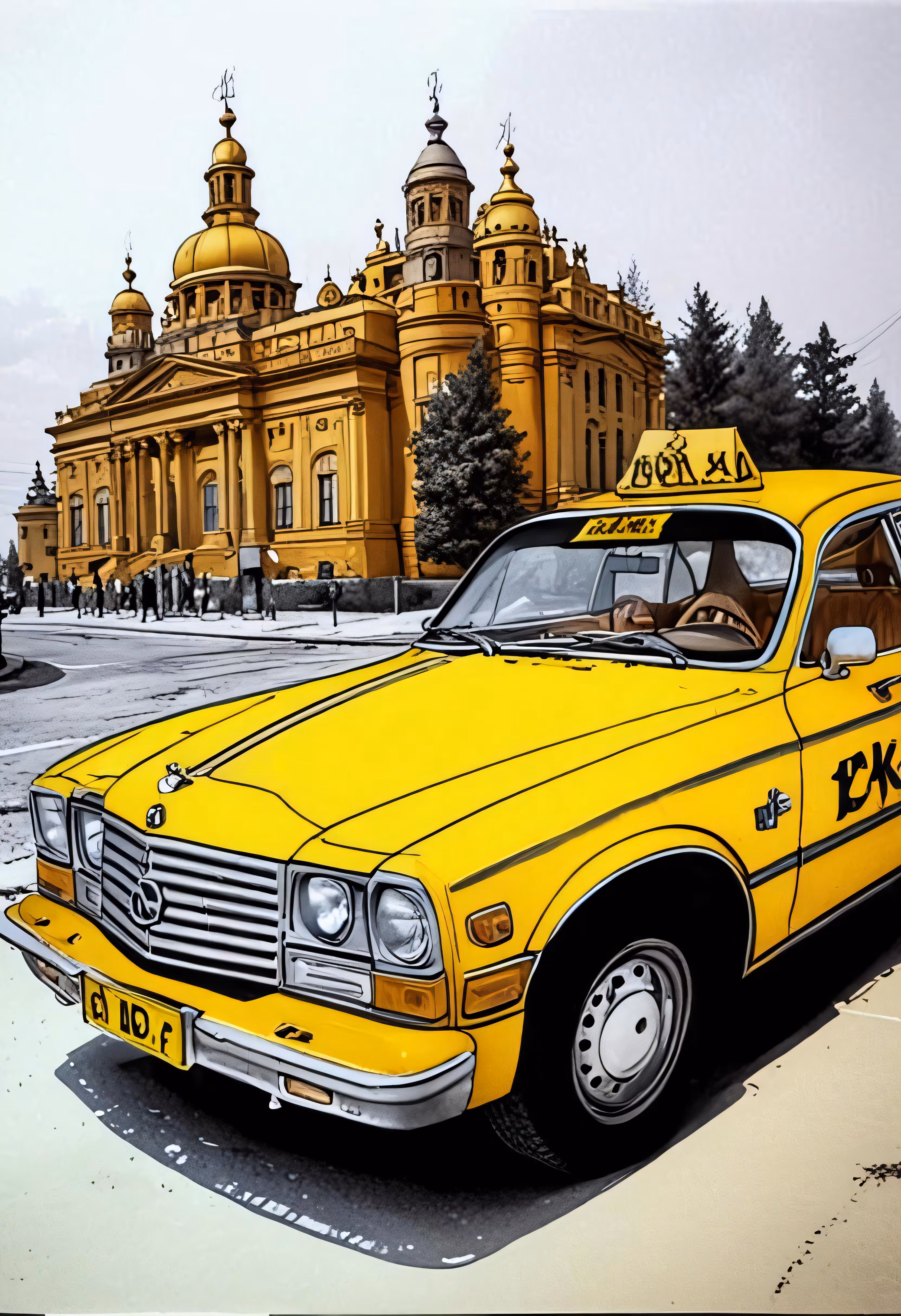 High resolution picture, free to use, a yellow taxi cab sitting in front of an old building