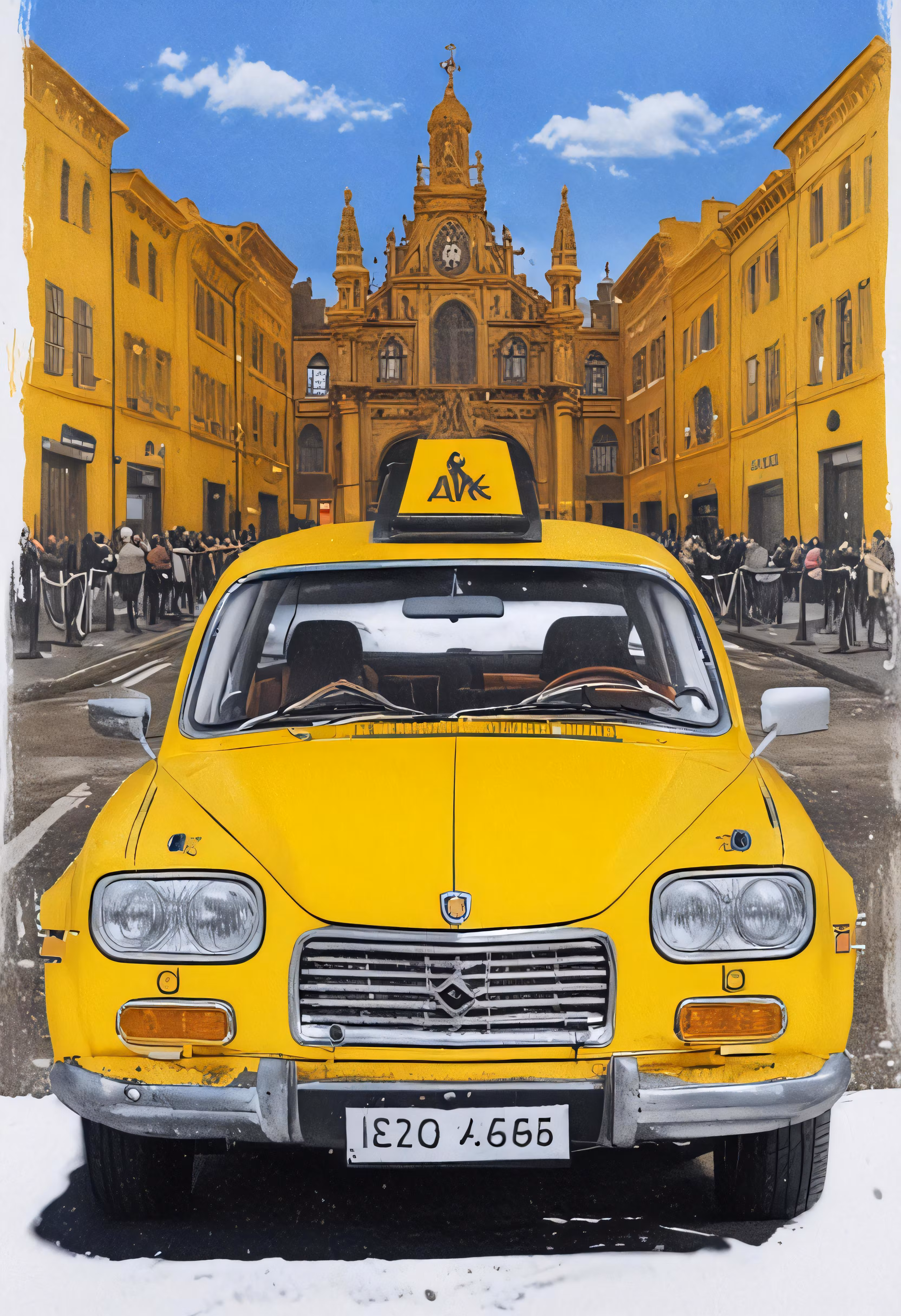 High resolution picture, free to use, a yellow taxi in front of some large buildings