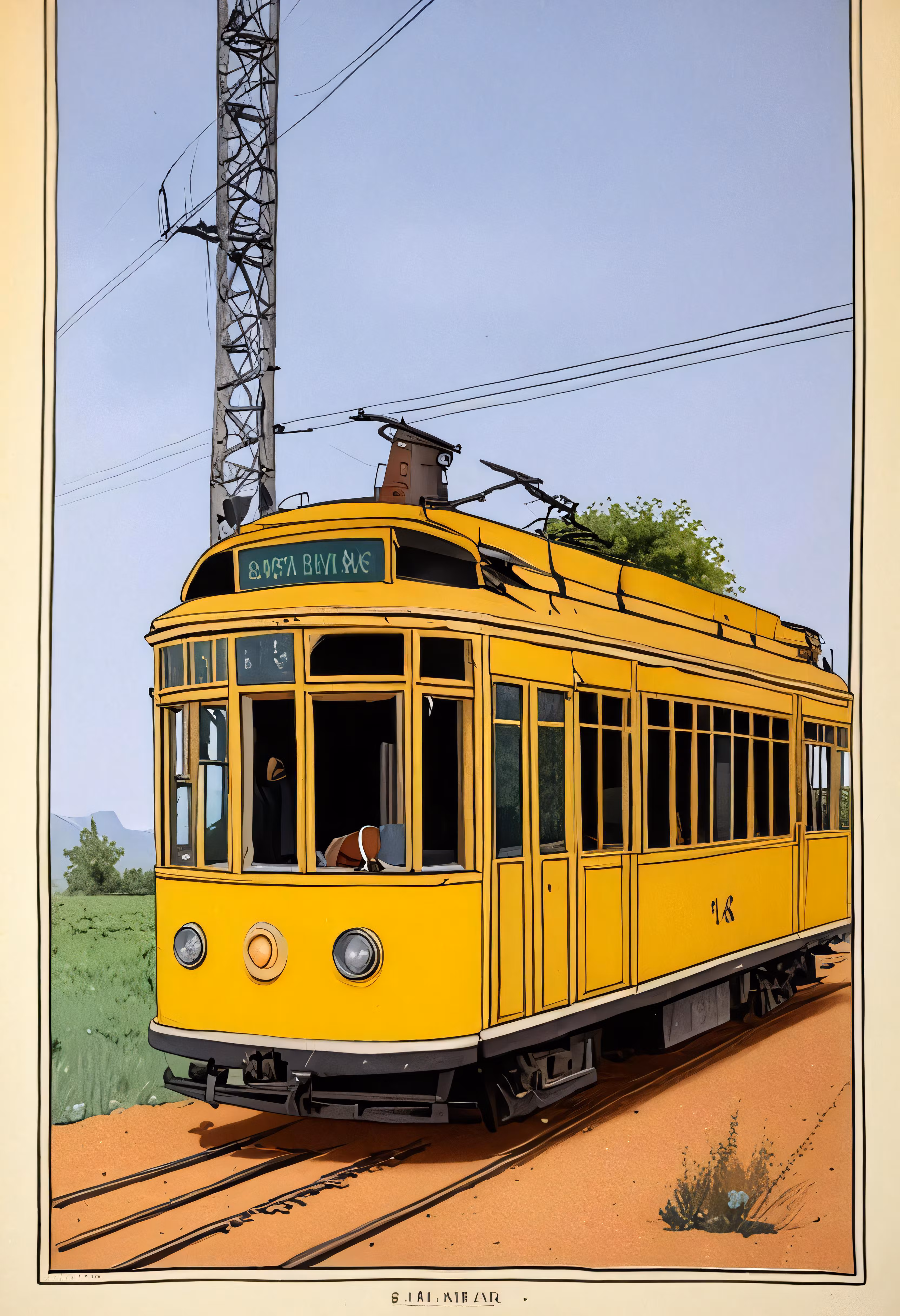 High resolution picture, free to use, a yellow trolley car on the tracks in an old postcard