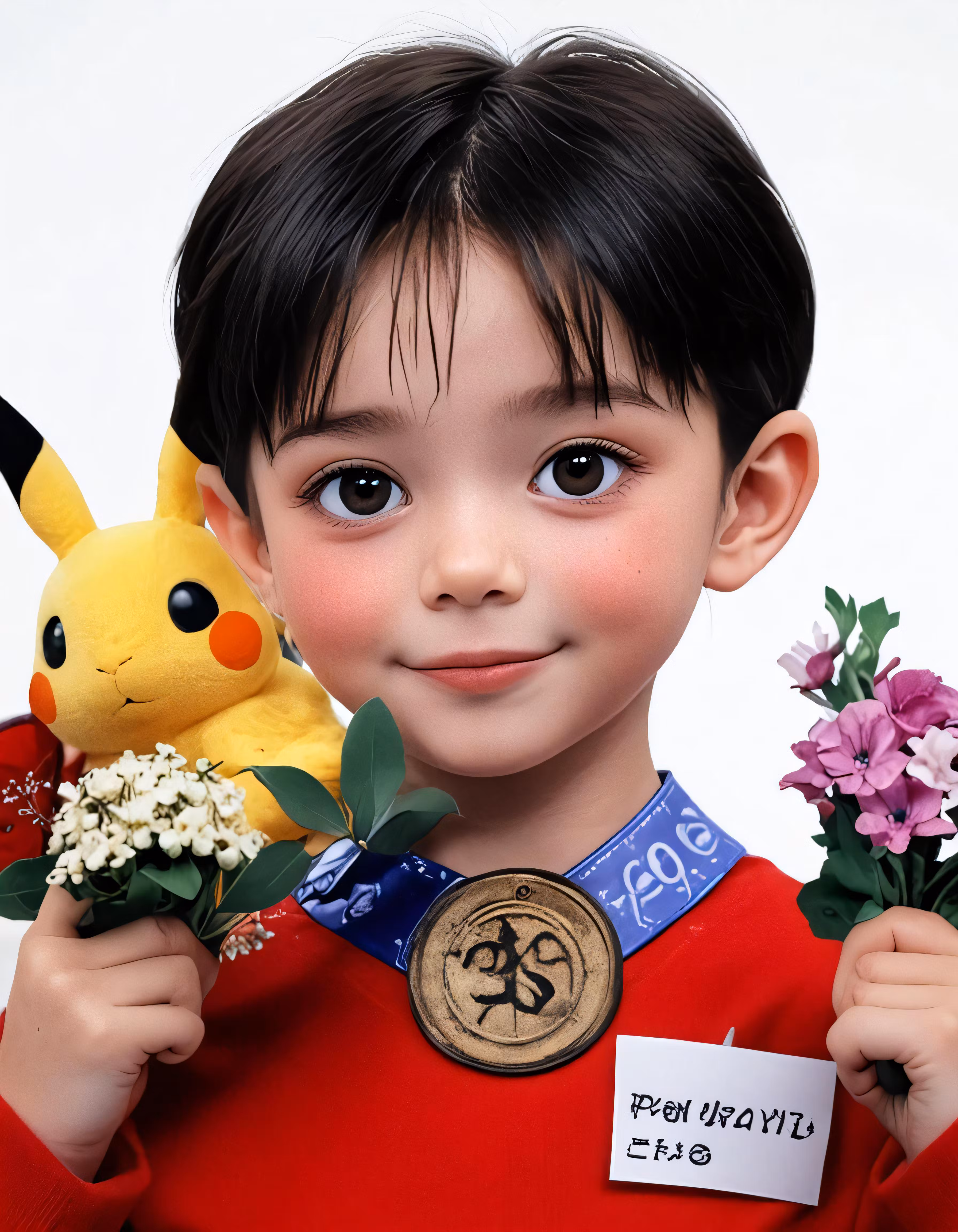High resolution picture, free to use, a young boy wearing a red shirt holding flowers and a gold medal