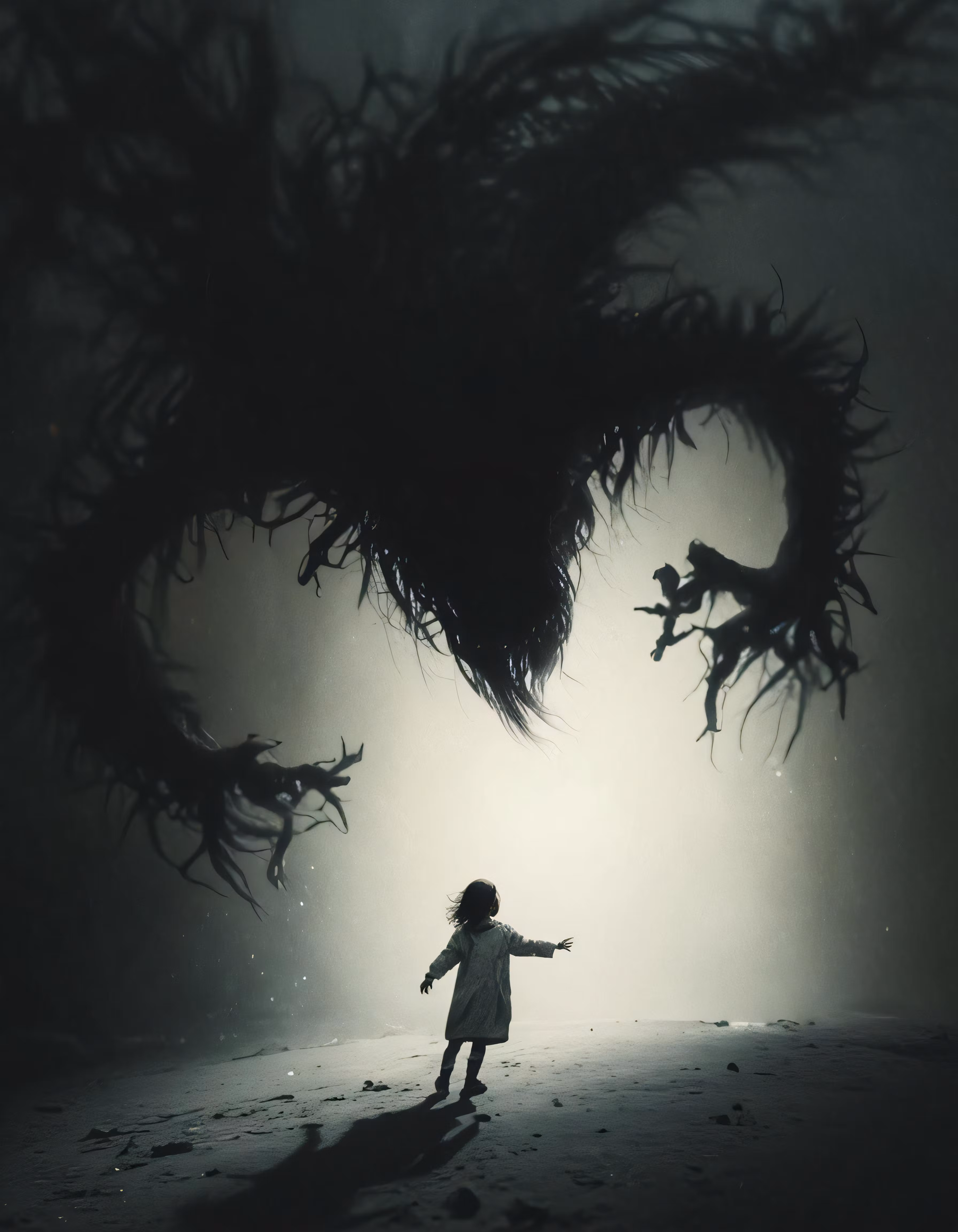 High resolution picture, free to use, a young child in a white coat playing with large, creepy objects