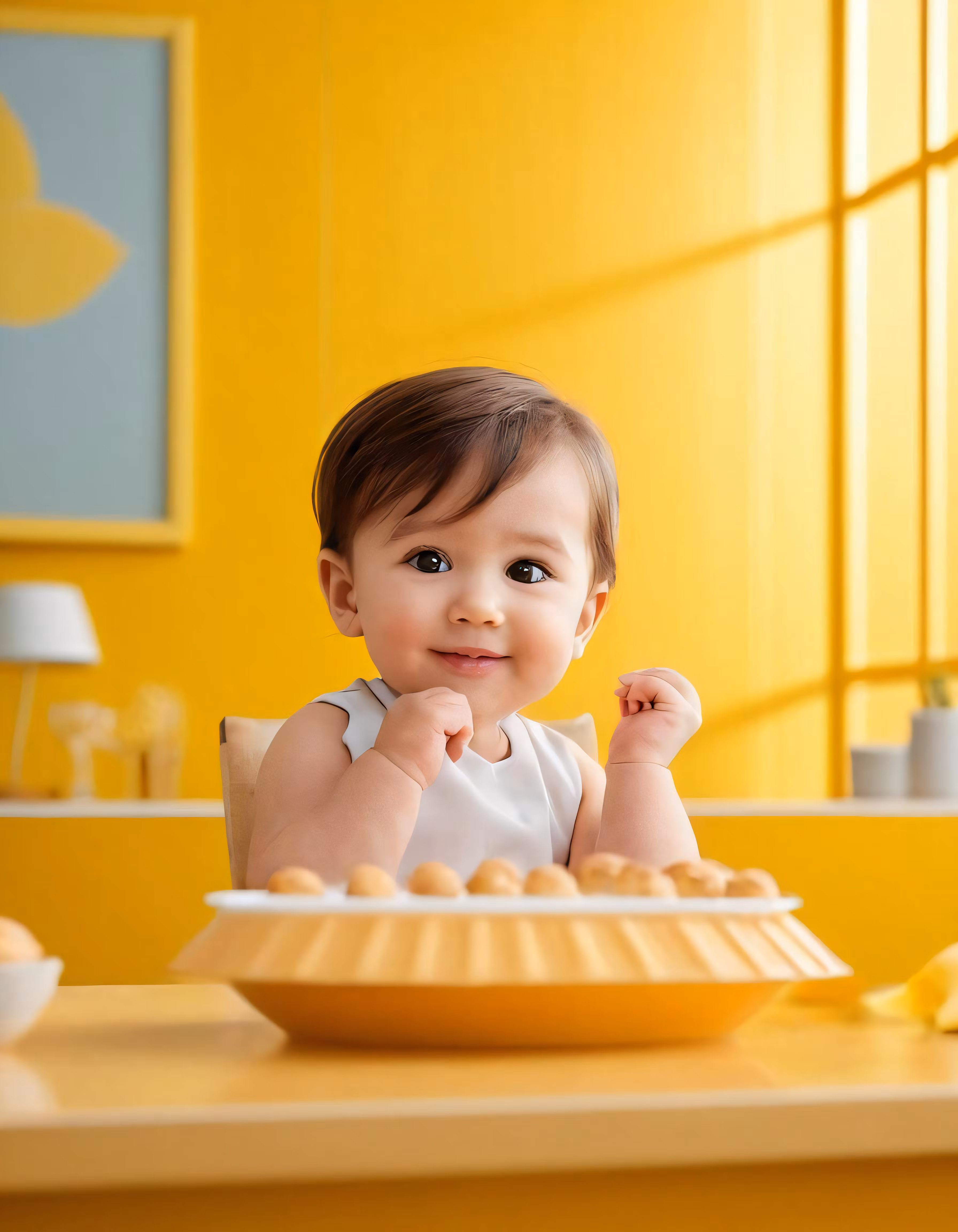 High resolution picture, free to use, a young child seated in front of a bowl and plate of food