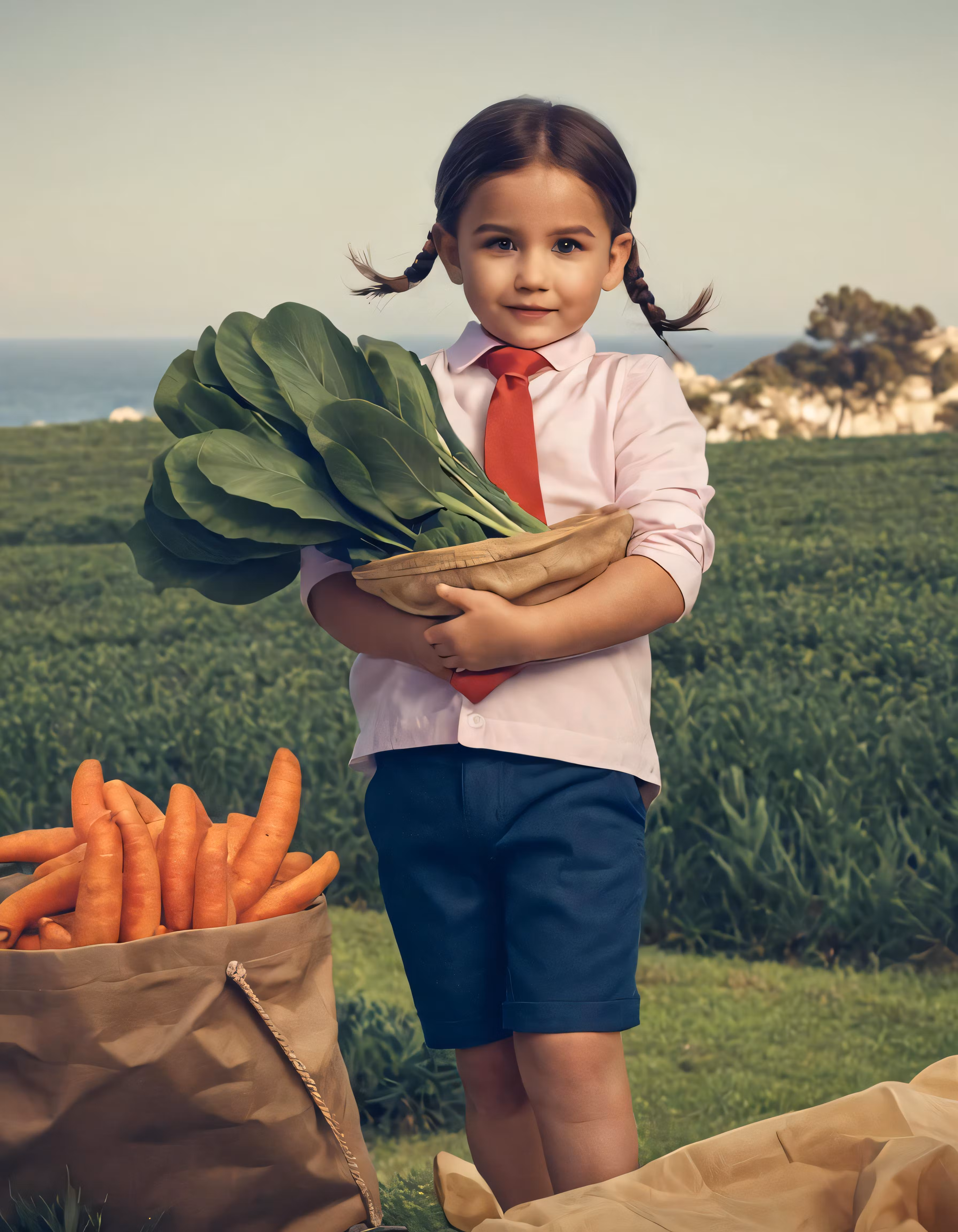 High resolution picture, free to use, a young girl holding up greens next to a bag