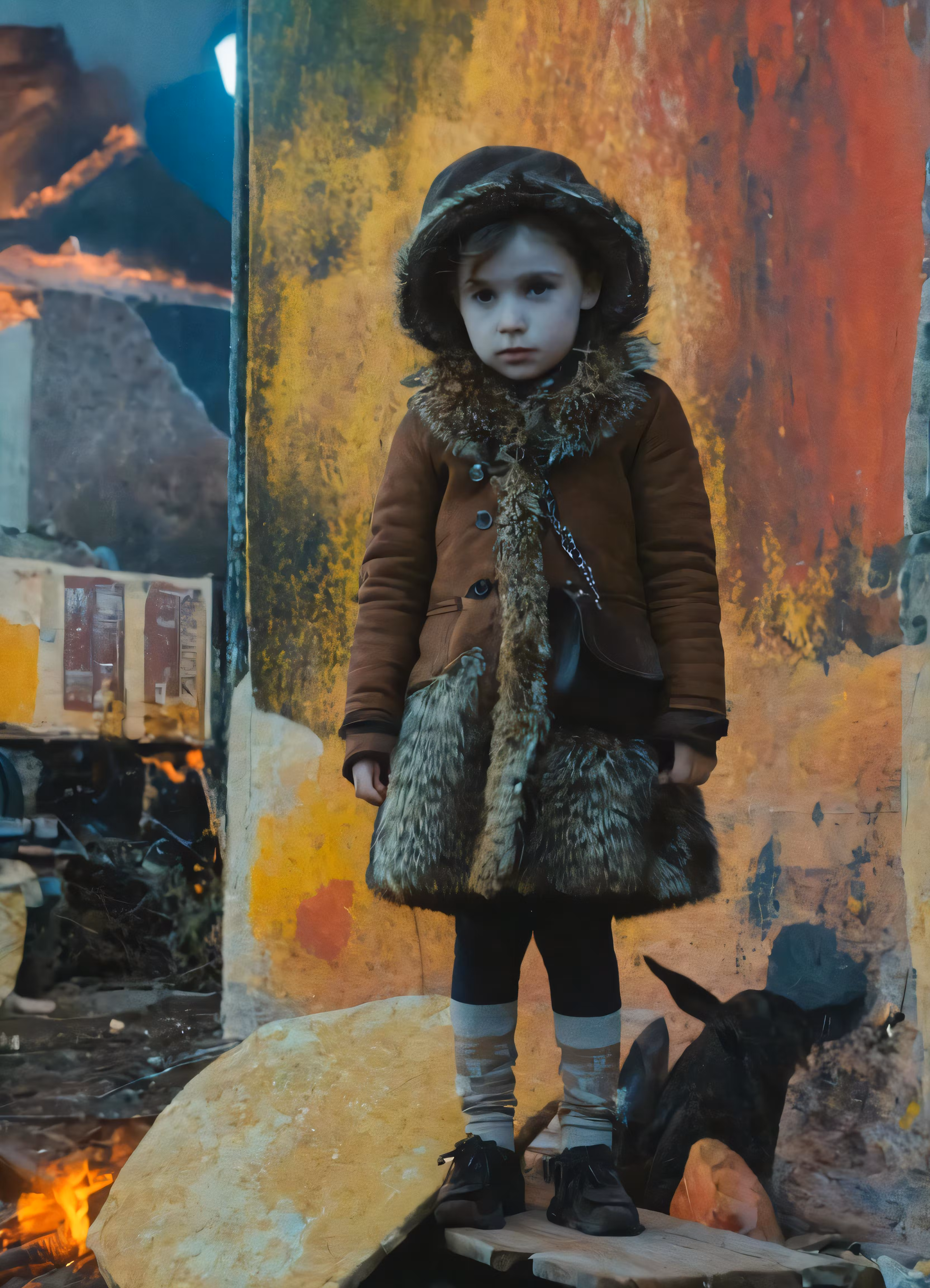 High resolution picture, free to use, a young girl in a brown coat stands in front of a fire
