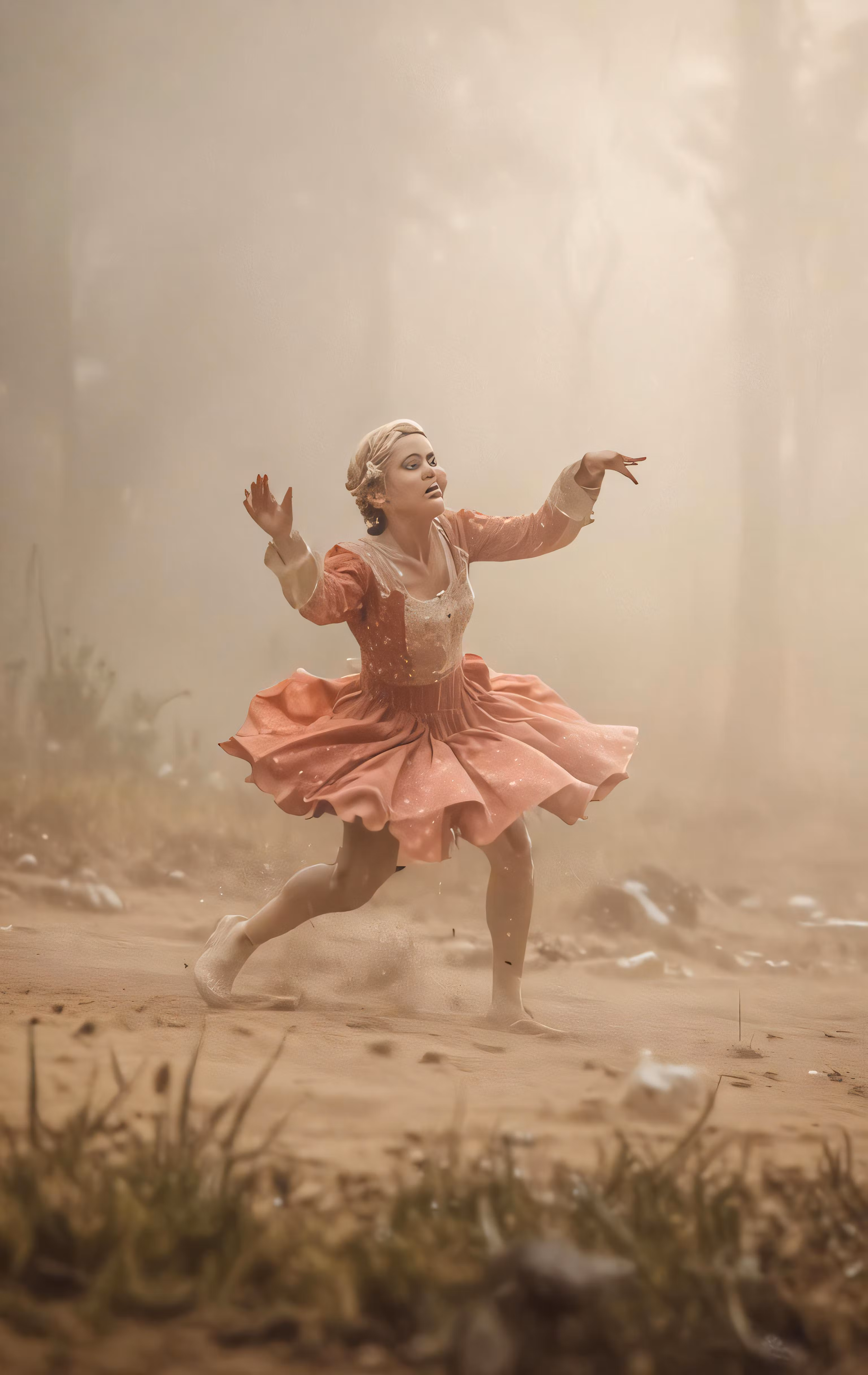 High resolution picture, free to use, a young girl in a red and pink dress dances in the middle of the fog