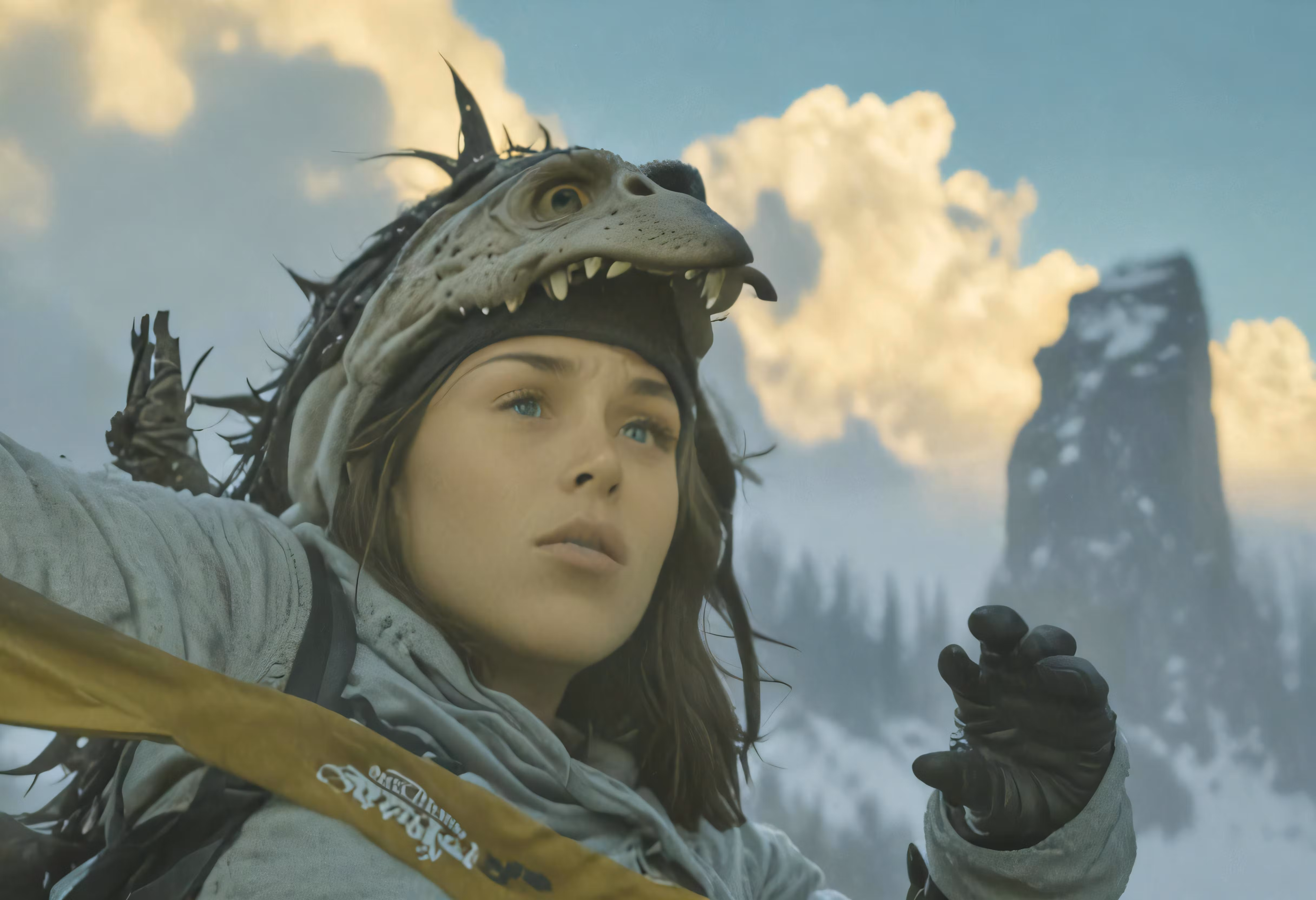 High resolution picture, free to use, a young girl in an icy wintery landscape stares at the sky