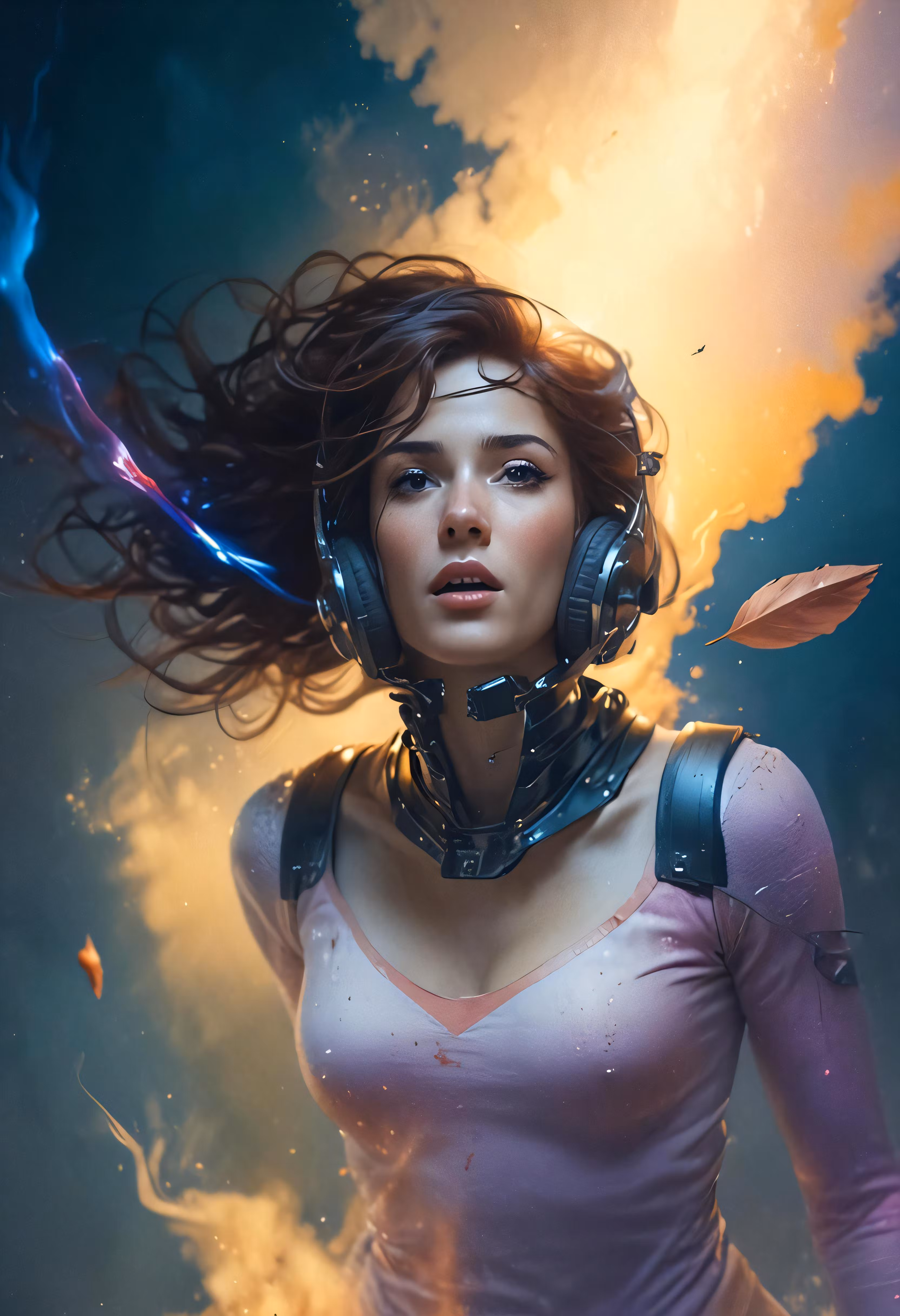 High resolution picture, free to use, a young girl in headphones with feathers and hair