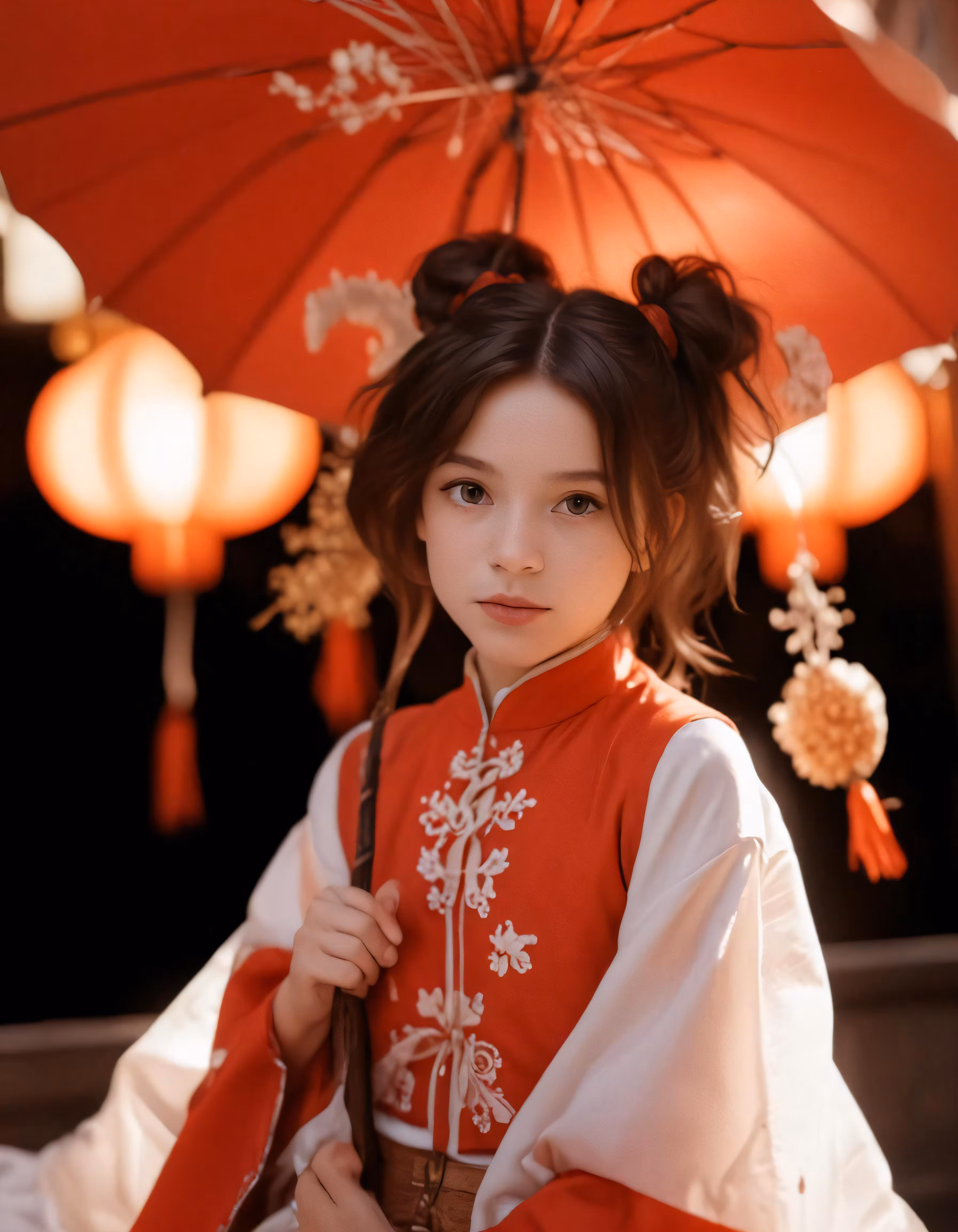 High resolution picture, free to use, a young girl in oriental costumes standing underneath an umbrella