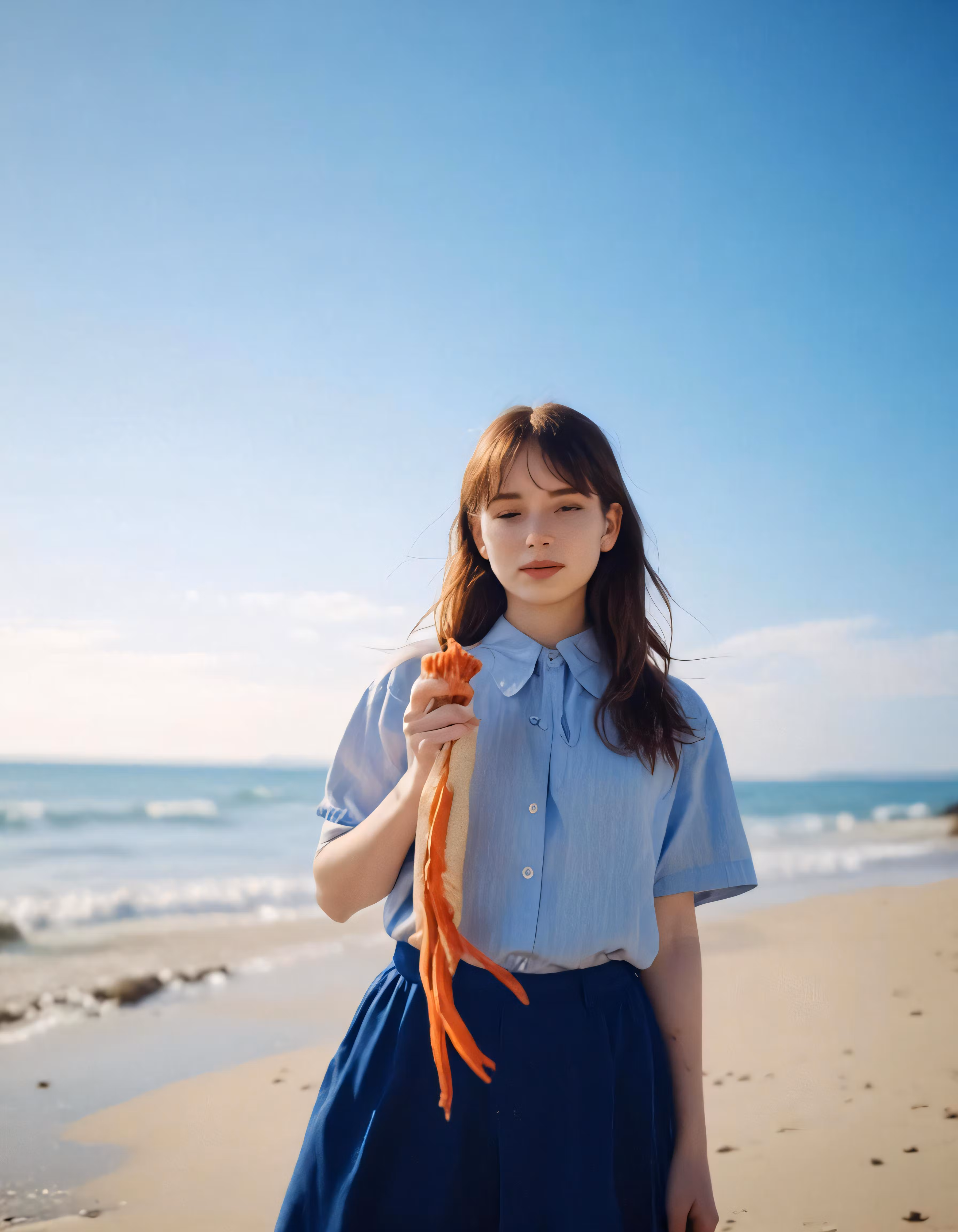 High resolution picture, free to use, a young girl is holding a stuffed animal on the beach