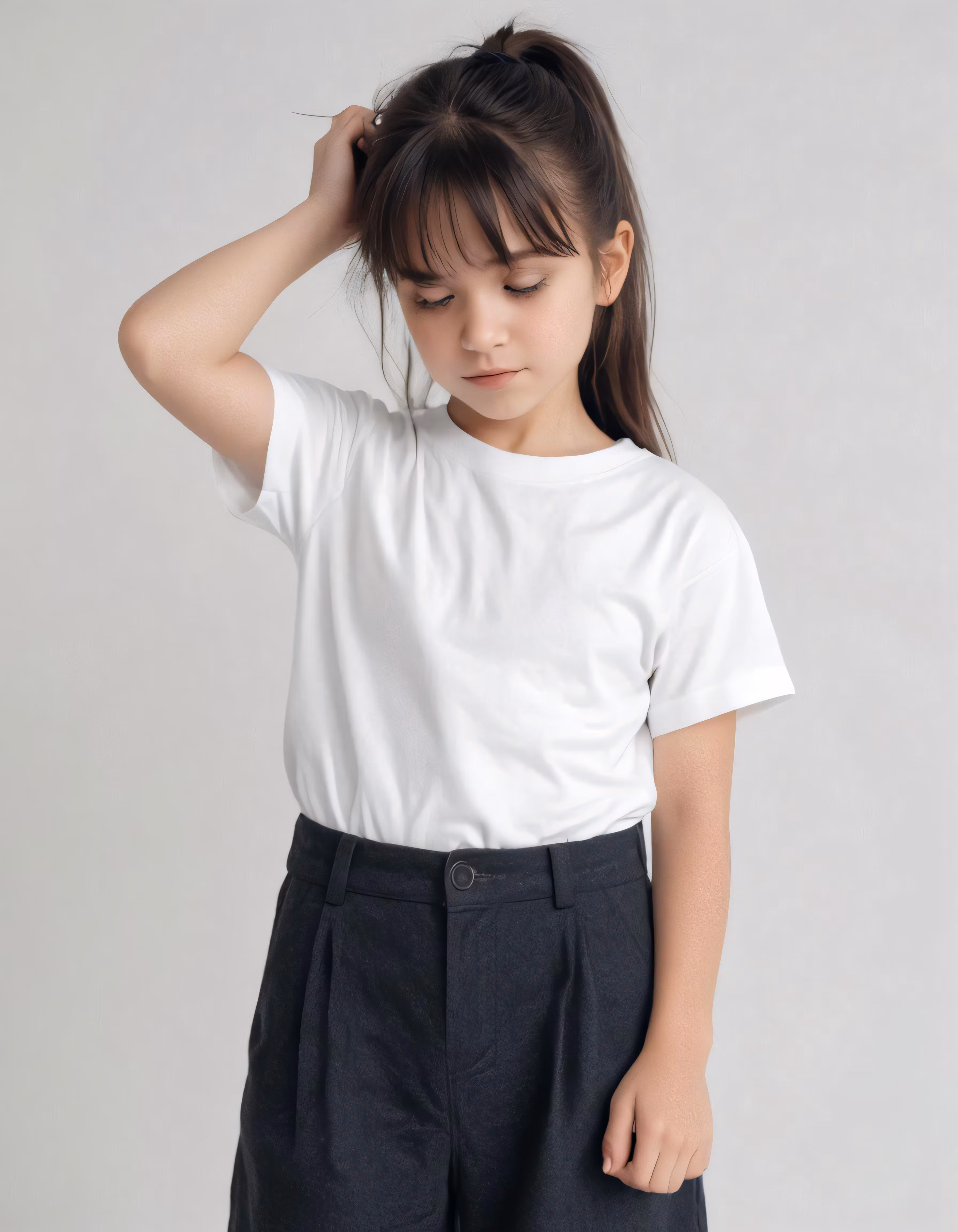 High resolution picture, free to use, a young girl is wearing black pants and a white tee   shirt