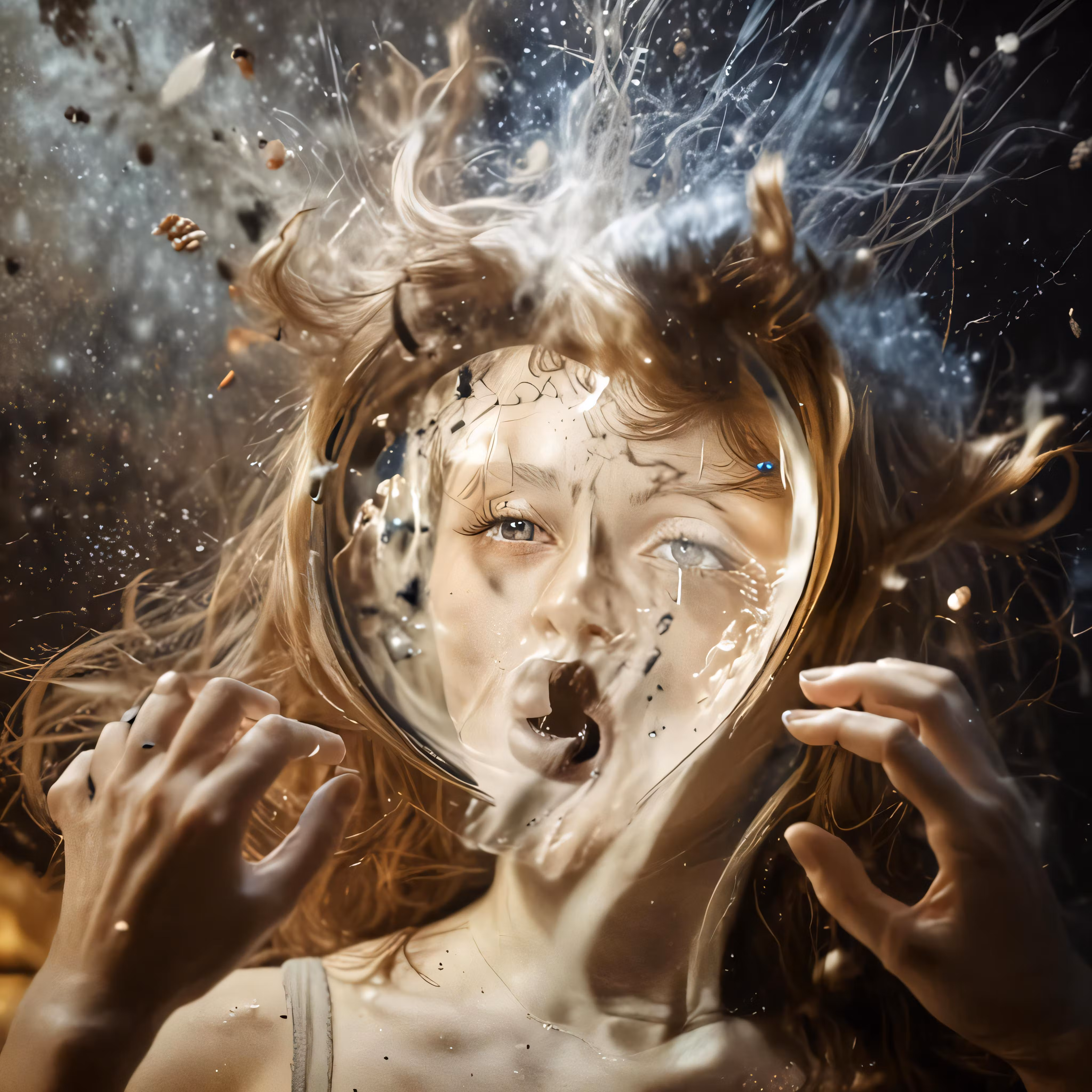 High resolution picture, free to use, a young girl looking into the mirror with hair blowing in the wind