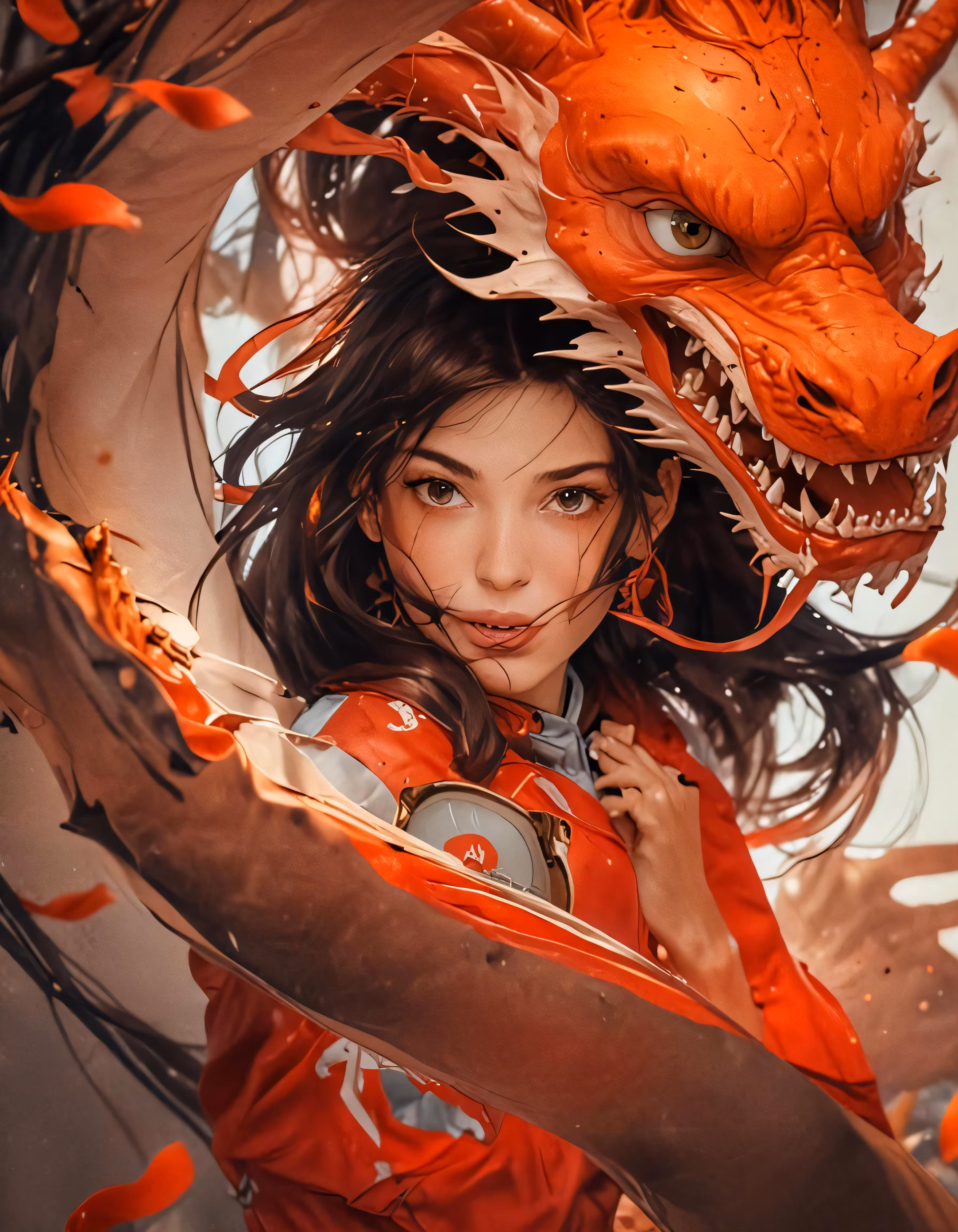 High resolution picture, free to use, a young girl wearing a red dragon outfit and holding a small orange clock