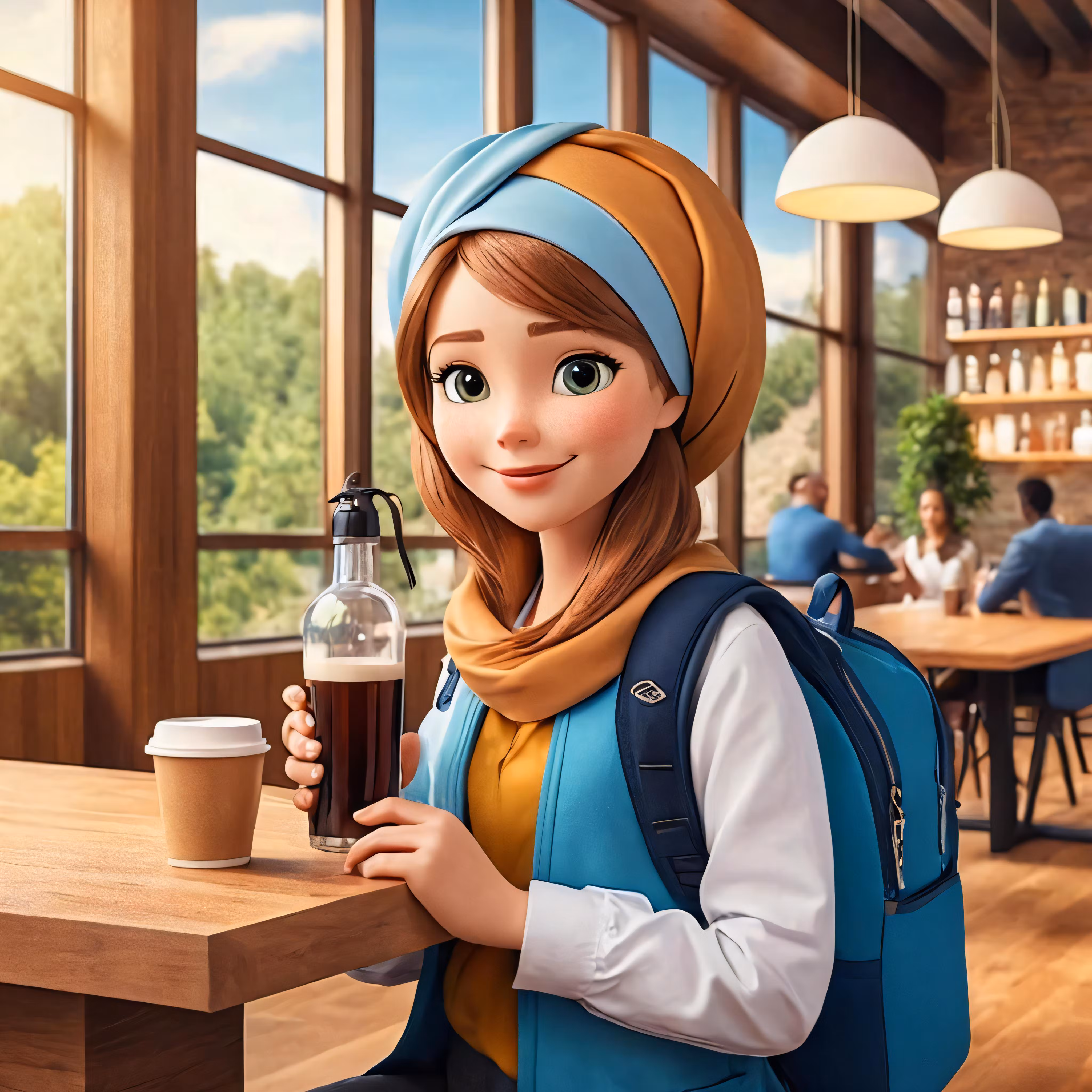 High resolution picture, free to use, a young girl wearing a turban with a backpack holds a coffee cup