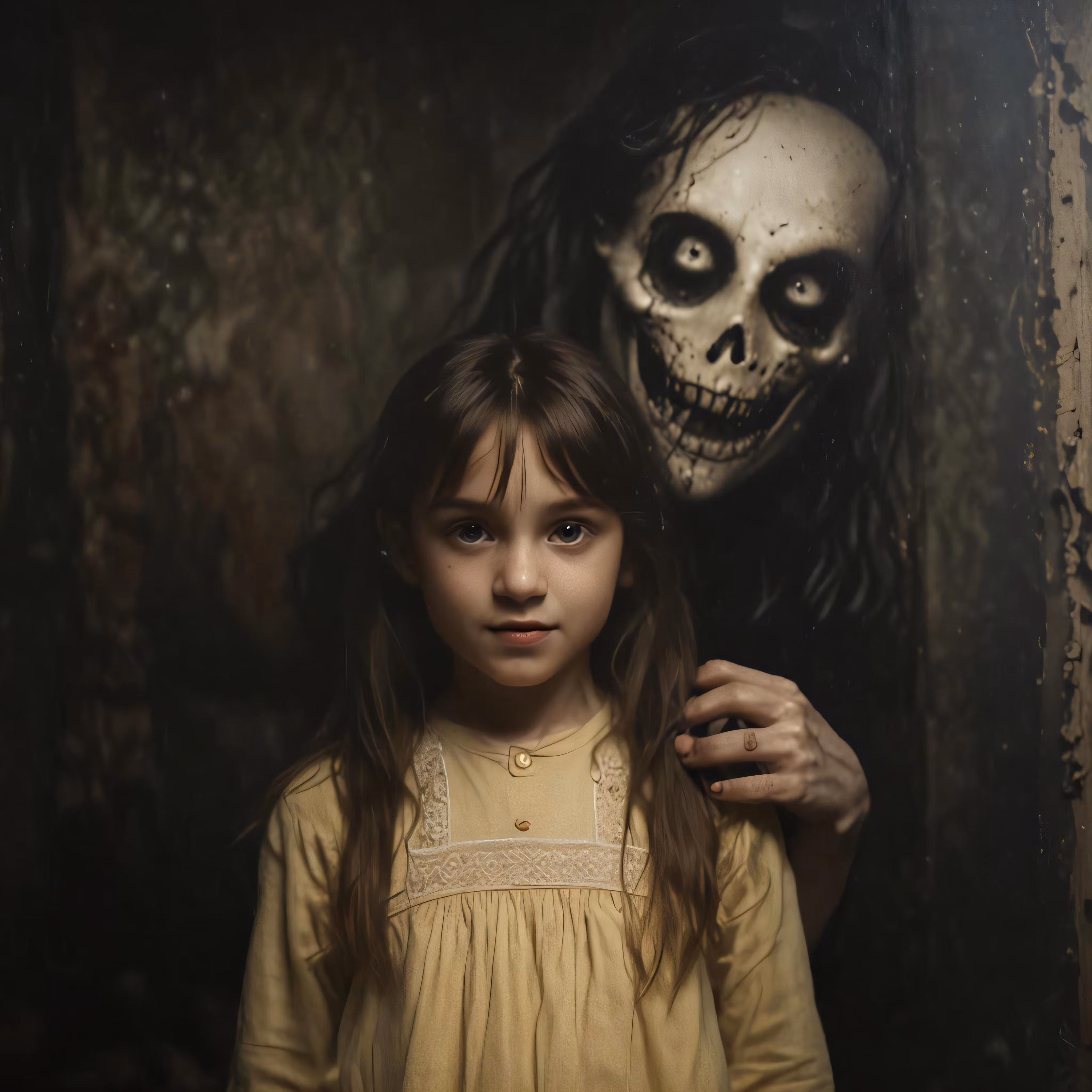 High resolution picture, free to use, a young girl wearing a yellow dress stands in front of a creepy skeleton