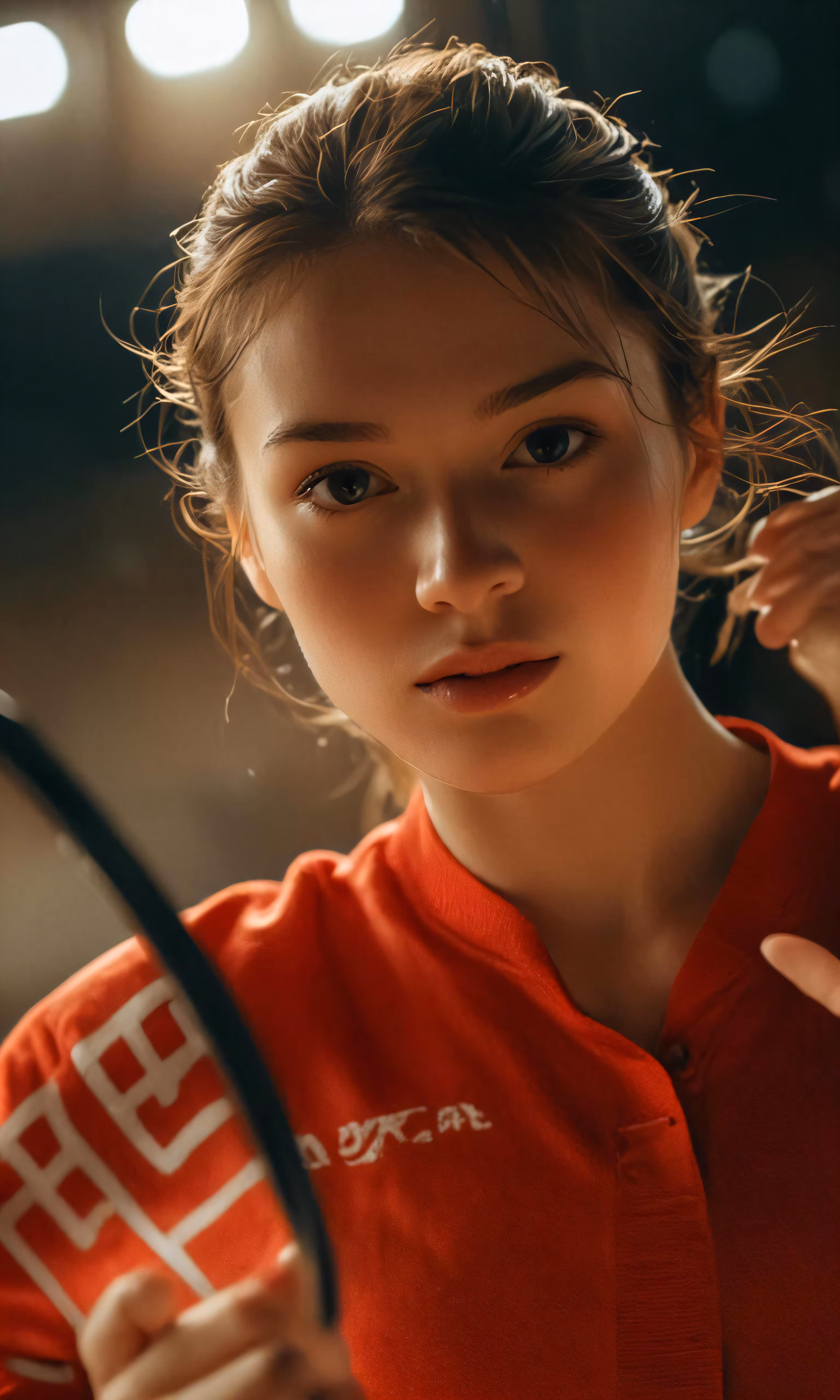 High resolution picture, free to use, a young lady in an orange shirt holding a tennis racquet