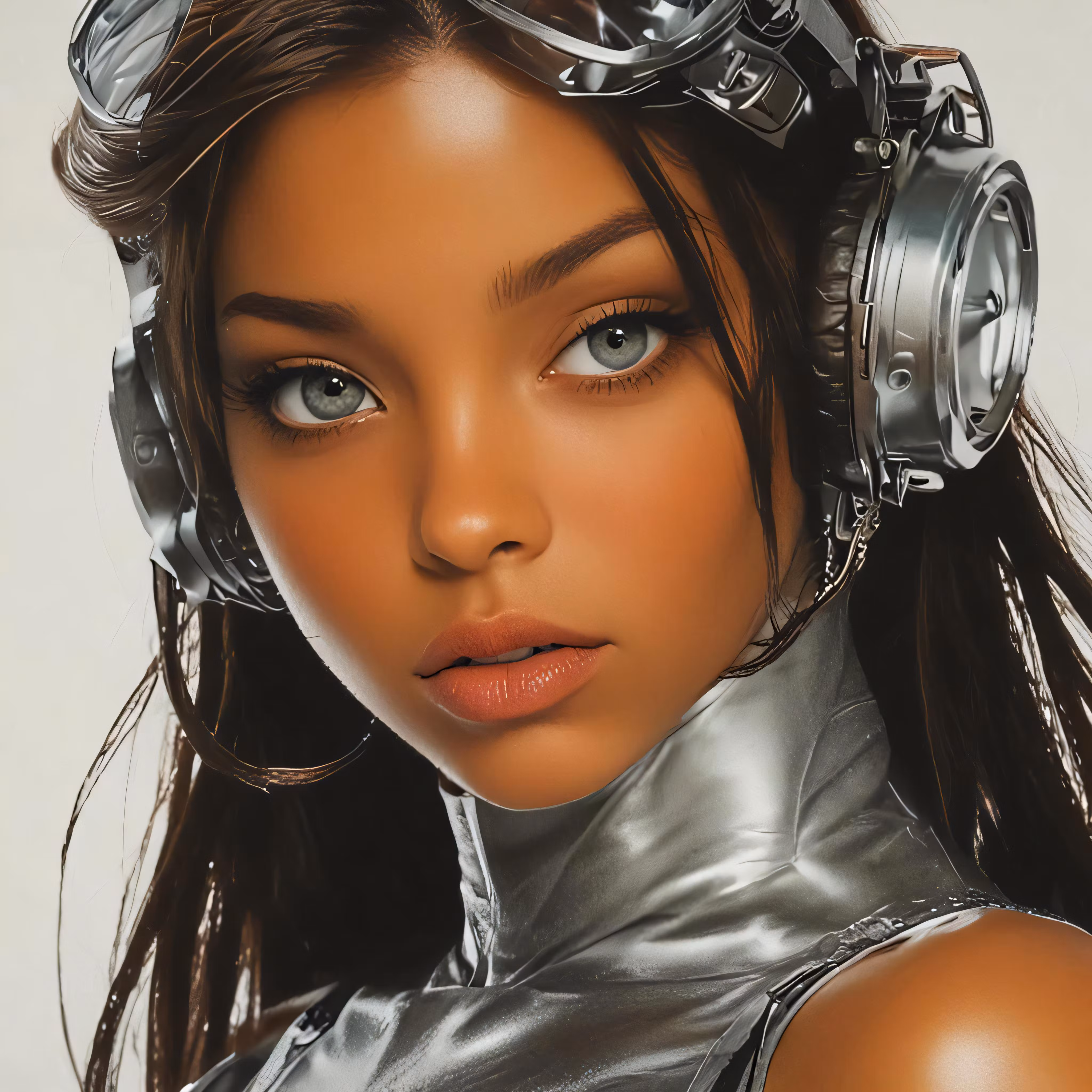 High resolution picture, free to use, a young lady in silver holding several metal headphones